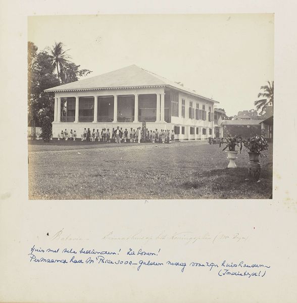 Curator: This albumen print, dating from around 1863 to 1866, is entitled "Batavia - Photographisch Atelier Woodbury & Page". Woodbury & Page, of course, being the photographers who captured this scene. Editor: It has a certain stilted quality that you often see in early photography. There's a stillness that suggests careful arrangement, a kind of posed formality despite the ostensibly casual setting. Curator: Exactly. It speaks to the technical limitations of the time but also the aspirations of photography to emulate painting, specifically group portraiture, echoing, say, some Dutch Golden Age styles in terms of its composition and subject matter. Editor: And the location, Batavia—modern-day Jakarta—tells its own story. You sense the colonial presence in the architecture of the building and perhaps in the dynamic, the arranged subjects themselves. Curator: The architectural elements indeed structure the visual field. The colonnaded veranda, the symmetry of the building...it creates a clear hierarchy in the composition, framing the individuals positioned within. The light also accentuates the textures of the clothing and architectural details, contributing to a detailed rendering. Editor: It's interesting how photography at this moment becomes intertwined with documentation, especially in colonial contexts. The studio here not only captures but almost constructs a vision, perpetuating certain perspectives of place and people through careful selection of those details, doesn't it? Curator: Certainly. Its function shifts from mere visual record to ideological assertion and the establishment of orientalist aesthetics in visual form. The clarity with which certain racial groups are depicted reinforces prevailing colonial power structures within the photograph's narrative itself. Editor: The photograph has far more visual weight as we unpack its context and think about what is highlighted, suppressed, and presented in its framing. Curator: Indeed, by analyzing formal qualities alongside the historical circumstances, the work reveals deeper societal meanings embedded in seemingly simple documentation. Editor: Thinking about it all together, this artwork becomes an important reflection about vision and representation. Thank you.