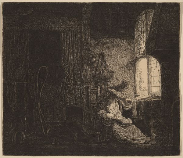 Polynice Auguste Viette created this detailed print, "Interieur met gezin," with etching. The composition invites us into a domestic scene rendered in a tight, enclosed space with close attention to detail through the meticulous etching. The arrangement of the figures—mother and child, father in armor, and supplicating daughter—creates a semiotic tableau. Viette's choice to depict the father in armor, an anachronistic element, disrupts the temporal logic of the scene. Note the contrast between the protective gear of the father and the softness of the mother holding her child, and the presence of a window suggesting both enclosure and an opening to the external world. This etching invites questions about the nature of protection, family roles, and the gaze of both the artist and the viewer within the domestic sphere. It offers a subtle commentary on societal structures and the performance of roles within the family unit.