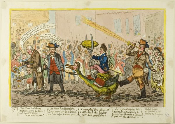 Editor: This etching by George Cruikshank, titled "The Spafields Orator Hunt-ing for Popularity to Do-good!!!," dates to around 1817. The scene feels chaotic, crowded with figures, and clearly satirical. What do you see in this piece, especially considering the period in which it was made? Curator: I see a scathing critique of early 19th-century British politics and social unrest. Cruikshank, through caricature, is likely targeting Henry Hunt, a radical orator, and the Spa Fields riots. Consider the context: post-Napoleonic Wars, economic depression, widespread poverty. These conditions fueled popular discontent, which Hunt and others capitalized on. Ask yourself, who benefits when those at the margins mobilize? Are those who stand to gain necessarily allies of the oppressed? Editor: So, the "hunting" in the title isn’t literal. It's Hunt pursuing popularity? Curator: Exactly. Think about the visual cues: the exaggerated features, the frenzied crowd, the mock-heroic title. Cruikshank suggests that Hunt is less interested in genuine social reform and more in self-aggrandizement, perhaps even inciting further unrest for his own benefit. Are the masses following Hunt's agenda, or is Hunt appropriating the popular will to consolidate his personal power? Editor: It makes you wonder about the motivations behind these movements and who they truly serve. Curator: Precisely. And Cruikshank challenges us to look critically at these figures. It is relevant even today as an important commentary on performative activism. We can use these historical cues to further examine more modern social movements. It is a stark reminder to stay grounded in a philosophical approach to political upheaval, always asking about the real change, if any. Editor: This definitely gives me a lot to think about and helps me understand the work on a deeper, more historical level. Curator: Indeed, and remember to continually analyze how art both reflects and shapes socio-political dialogues.