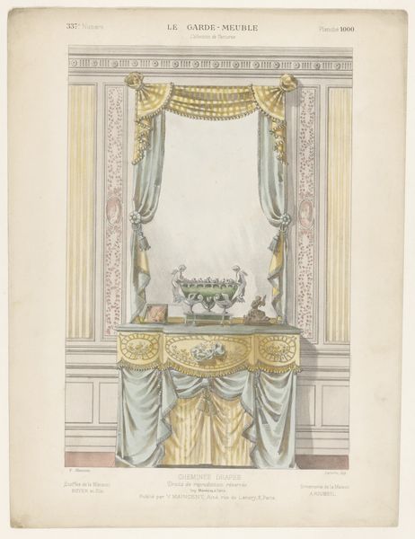 Editor: This watercolor and print drawing titled "Venster met gordijnen," or "Window with Curtains," dates from around 1885 to 1895 and is by Léon Laroche. The piece presents an interior view of an armchair looking out to a seascape through decorative curtains. I find it interesting how much emphasis is given to interior decor, which feels very theatrical. What's your interpretation of this work? Curator: The focus on interior decor during this period, particularly within the context of Romanticism, often spoke volumes about social aspirations and cultural identity. These draperies and the armchair, while seemingly benign, were markers of class and taste. Given that this piece includes fishing equipment as part of the design, I wonder about its relationship to maritime history, and perhaps even colonial narratives of resource extraction? What statement might the artist be making by incorporating fishing gear into this lavish setting? Editor: That’s a thought-provoking perspective. I hadn’t considered the fishing gear as potentially alluding to broader socio-economic and power structures, rather I was simply thinking about it in relation to maritime leisure. Curator: The 'leisure' aspect itself is key here. Whose leisure is being represented, and at what cost? This piece gives us insight into the culture of the decorative arts and can be re-examined as a visualization of that era's values. Do you think there are any visible connections to social class beyond just “taste?” Editor: Thinking about it now, I see how the over-the-top theatrical display speaks to privilege. Thanks for sharing your expertise. Curator: Of course. Recontextualizing pieces allows them to open to many views. I now wonder about the identity of the inhabitant as displayed in this design and what can be said about their values based on the choices displayed.