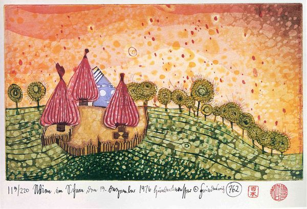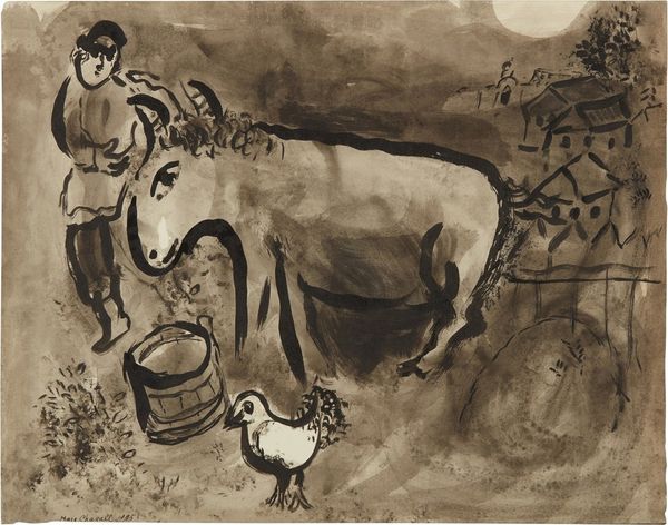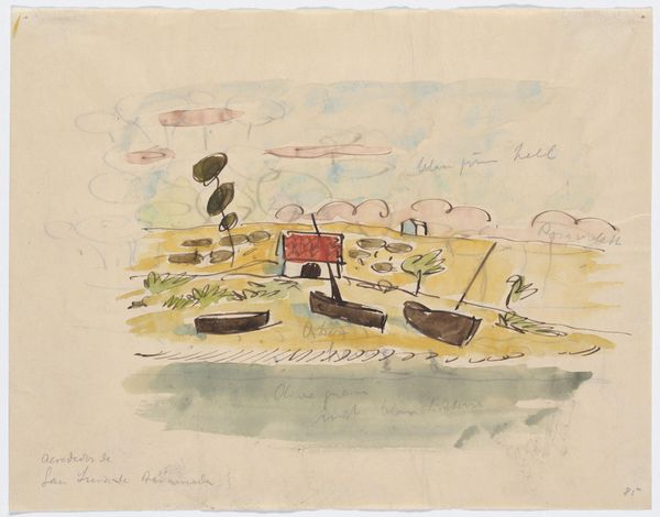 Editor: Julian Trevelyan's "Hay-Cart" presents a rather surreal rural scene. The figures on top of the hay and the stark shapes create a dreamlike mood. What social commentaries, perhaps about labor and leisure, do you see embedded in this work? Curator: This print resonates with Trevelyan's engagement with social realism, and the romanticization of rural labor can be problematic. Are those figures celebrating, or simply taking a break from strenuous work? Does the naivety of the style critique or reinforce the idea of rural life being uncomplicated? Editor: I hadn't considered the potentially naive perspective. The figures almost seem carefree, but the context of agricultural work could suggest otherwise. Curator: Exactly. Considering the historical backdrop and the artist's social awareness, it invites us to reflect on labor, representation, and the complexities within seemingly simple scenes. Editor: That definitely adds a layer of critical understanding to what I initially perceived as a whimsical image. Thanks for the insight! Curator: My pleasure. Art always prompts a deeper examination of ourselves and the world around us.