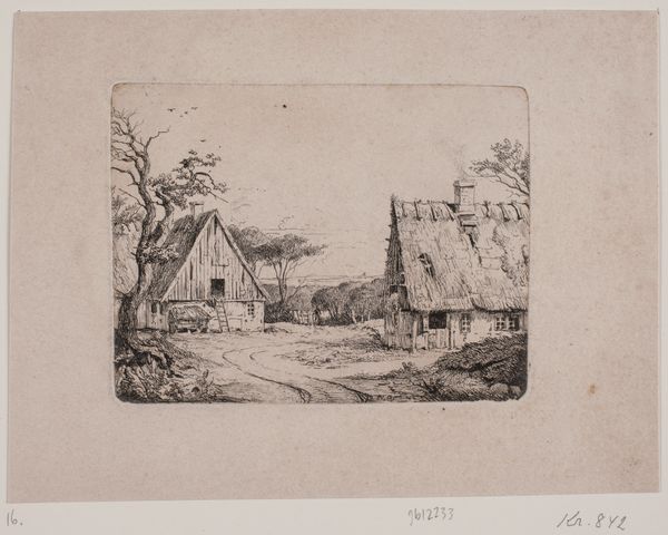 Editor: This is "Village Scene," an undated print by Victor-René Garson, made using lithograph, watercolor, and other drawing methods on paper. It gives me a rather melancholic feeling because there are figures walking by a dilapidated building. How do you interpret this work? Curator: That sense of melancholy is interesting. I see this "Village Scene" not just as a landscape but as a depiction of a society perhaps undergoing transformation or even decline. The presence of figures walking past dilapidated architecture evokes a consideration of class. Is this a depiction of rural poverty? Who inhabits these buildings, and what is their relationship to the land and the burgeoning urban centers of the time? Editor: So you are thinking about the people and their socio-economic environment. How can we determine if this is poverty, and if Garson meant it to look like that? Curator: The state of the building, alongside the figures' clothing, hint at economic hardship, but also raise the question: does Garson critique this, or romanticize the hard life of rural populations, as many artists of the era did? We should ask, what purpose might such a romanticization serve in a rapidly industrializing society? How might the artist's positionality shape such a perspective? Editor: This gives me a totally new way of approaching art. Now, when I look at any landscape I will question what it suggests about the interaction of people and place, and class. Curator: Exactly! Examining art through the lens of social and historical context enriches our understanding. The more we look into intersectional questions such as class, race, and gender, the more art offers fascinating insights.