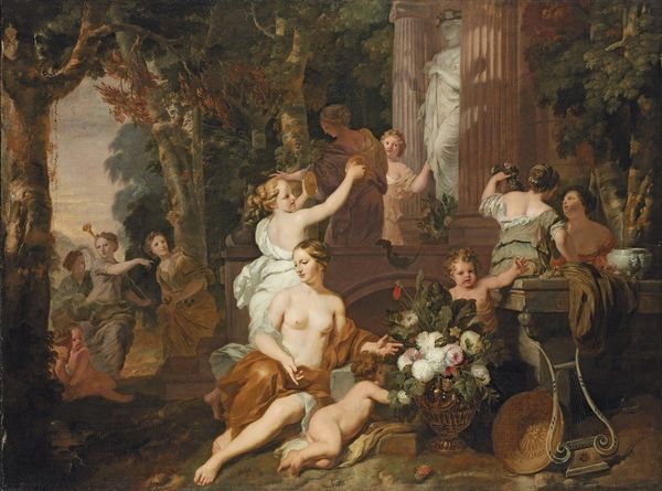 Jan Verkolje painted "Herse Preparing to Receive Mercury" using oil on canvas. The composition is striking; light is focused on Herse, centrally positioned, creating a visual hierarchy. The theatrical use of red drapery above and the figures arranged around her evoke a sense of drama and anticipation. Verkolje's treatment of light and shadow—chiaroscuro—adds depth and volume, highlighting the sensuality of the scene. The semiotic elements in the painting, such as the discarded arrows of Cupid, suggest a shift from innocent love to divine eroticism. The architectural setting, with its classical columns, points to themes of power and fate, framing Herse's acceptance of Mercury as an inescapable destiny. The contrast between the earthly and divine is further emphasized by the texture; the smoothness of Herse's skin against the rougher textures of the fabrics and stone. This contrast enhances the symbolic weight of the scene, underscoring themes of transformation and the interplay between mortal and immortal realms.