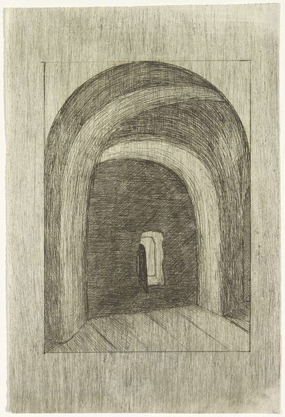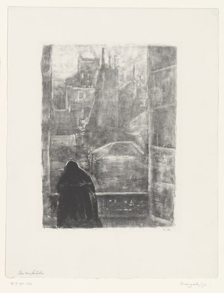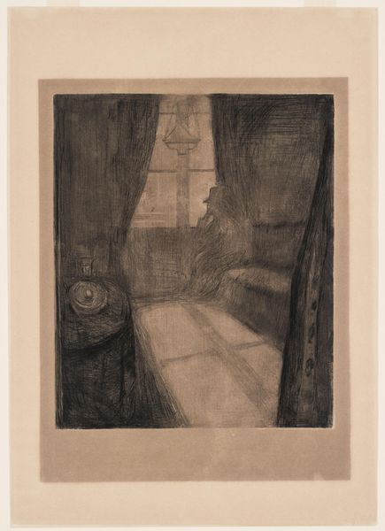 Edvard Munch created this print, Night in St. Cloud, using drypoint. Here we see a somber room, lit by moonlight, its stark light cutting through the gloom. This light, so often associated with mystery and the subconscious, has long been a symbol in art. Think of Caspar David Friedrich, who used the moon to evoke feelings of solitude. The window acts as a liminal space, a boundary between the internal world and external reality. The lonely figure by the window reminds me of Melancholia I by Dürer, where we see a similar posture and state of introspection. This posture seems to tap into something deep within us, speaking to the universal experience of loneliness and contemplation. The moonlight carries with it the emotional weight of memory, each gleam a reflection of the past. It's a potent force, engaging us on a profound level. This is not just an image; it is a mirror reflecting our innermost feelings.