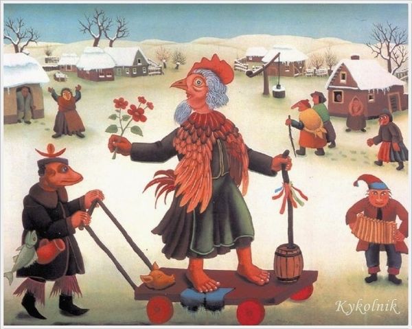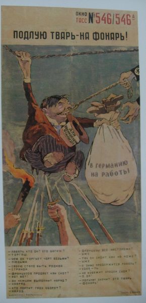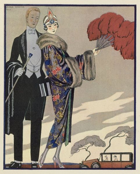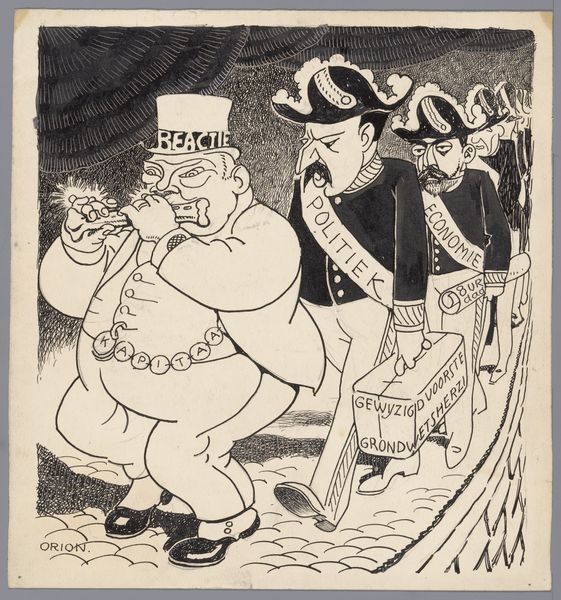 Editor: This is Boris Kustodiev’s “Sketch of Poster City gives Book - Village gives Products” from 1925, a painting on a poster. The composition seems simple at first, almost like a direct advertisement, but the more I look, the stranger the figures seem. What do you see in this piece, beyond just surface level messaging? Curator: I see a fascinating intersection of propaganda and social commentary masked as commercial art. This poster needs to be understood in the context of the New Economic Policy in the Soviet Union, where elements of capitalism were briefly reintroduced. It prompts questions about the relationship between the city and the countryside and critiques power dynamics. The figures representing "city" and "village" – who are they really serving, with these exchanges of ideas and products? What do the power structures look like in this trade? Editor: I hadn’t thought of it like that, I just took it for granted that the exchange was a good thing. Curator: The cartoonish quality is misleading, isn't it? Kustodiev exaggerates features to create caricature, and maybe this is highlighting the unequal benefits from this "exchange." Also, I want to ask about the cultural messages around the commodities of the village that seem to offer abundance and stability and contrast that with the potentially limited books in the city? Who exactly gets to have them? Do you notice anything else in this piece that reinforces the idea that this trade wasn't entirely equitable? Editor: Well, the figure representing the village is much bigger than the city figure, and he has far more products. And now that I think about it, I guess propaganda is never really straightforward, right? Curator: Exactly! Propaganda often subtly reinforces existing social hierarchies or attempts to create new ones. Thinking critically about the "why" behind these visual choices is the key. Editor: So, by looking closely and understanding the historical moment, we can unpack so many layers of social commentary embedded within seemingly simple propaganda. Curator: Precisely! Art is never truly neutral. Examining these works through the lenses of gender, race, class, and power, exposes the complex ways that art shapes our understanding of the world. Editor: That's an incredibly insightful perspective. I will look at art through an intersectional lens going forward, considering all angles of cultural influence and power dynamics within society. Thanks.
