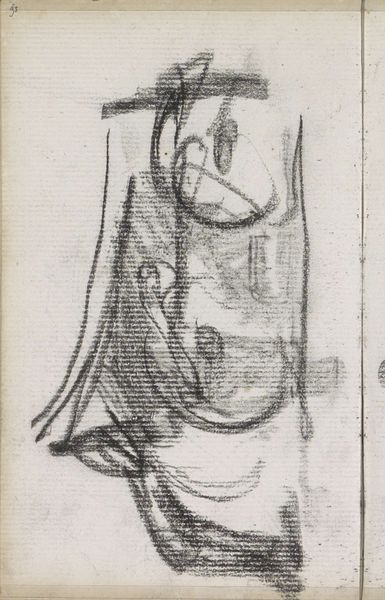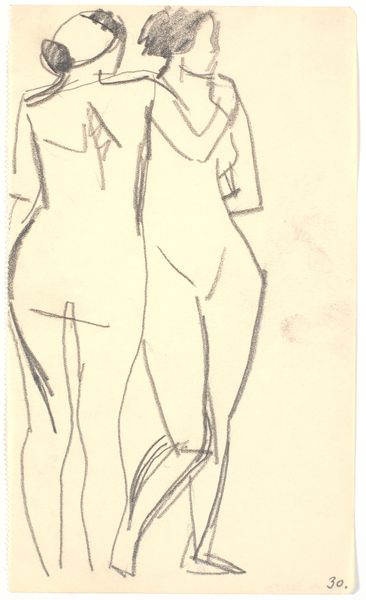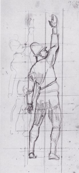 Curator: Here we have Ferdinand Hodler’s sketch, "Swearing to the Front," created in 1912. It’s a pencil drawing, capturing a figure in a moment of what seems to be great intensity. Editor: Yes, the upright gesture! His right arm extended rigidly upwards, he could be raising his hand for silence in a crowded room, or he might as well be casting some sort of magical spell... but, there’s this fragility, too, conveyed in the bare outlines of his body. Curator: The lack of detail, particularly below the waist, almost renders him spectral. It’s like Hodler is capturing not just a moment, but an ephemeral presence, evoking a state of transition or aspiration, as much as an embodied individual. Editor: I wonder, what symbols would someone at the time relate that hand gesture with? Was there some particular resonance with patriotism or some fraternal association...? Curator: Absolutely. Think about the broader context. 1912... Europe teetering on the brink of the First World War. This gesture becomes intensely relevant, possibly depicting allegiance, resolve, or sacrifice. What’s particularly moving, however, is Hodler’s line-based composition. Editor: The linear form gives that sense of both permanence and impermanence as a visual form itself! Something meant to be easily replicated like the distribution of a shared idea through symbol... A modern flag waving across borders. It makes it seem very prescient. Curator: It's the line as a symbol! And how these modernists manage to infuse seemingly basic visual components with symbolic significance that can evoke all the raw feelings that go along with it! Hodler transforms a sketch into a powerful symbol of... everything. Hope, despair, and duty bound up together. Editor: Exactly, it really embodies the potential of modernism as a bearer of cultural memory as well. A great study in cultural and emotive economy of means!