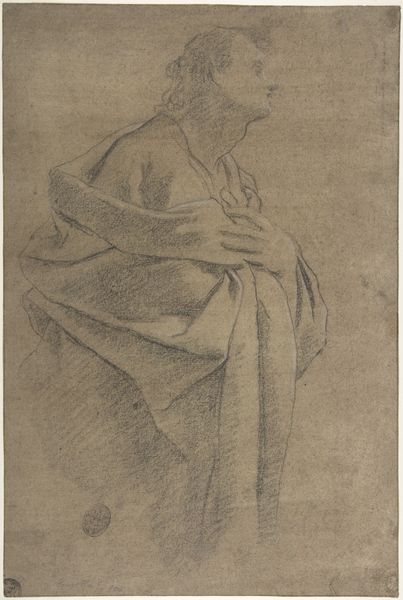 Curator: Lazzaro Tavarone's "Personificatie van de Snelheid of Behendigheid (Prontezza)," dating approximately from 1566 to 1641, is a striking pencil drawing. Editor: My first thought is the drapery, cascading around the figure. The artist masterfully captures its weight and texture with such simple means, and in an intriguing reddish monochrome that certainly defines its overall somber mood. Curator: Precisely! Consider the era—the late Renaissance and early Baroque periods. The sketch can be seen as exploring societal notions of swiftness or perhaps even virtue within a complex political landscape. What constitutes speed and agility, after all, when societies undergo massive changes and wars? Is it physical or is it a conceptual facility with historical processes? Editor: I’m more drawn to the subject's hands. One open, perhaps suggesting an offering, the other clutching the drapery. It's a beautifully balanced composition. Look at the contrasting line work—precise facial features against looser, more gestural rendering of the clothing. Curator: It does echo similar discussions on representations of women and power in the period; are we to read this speed as innately female and how does that correlate with patriarchal understandings of skill, strategy and knowledge in early modern Italian culture? I wonder how contemporaries perceived that relationship through the visual depiction and interpretation in this portrait. Editor: It's that tension, the balance of detail and suggestion, that I find so compelling. The composition, those sweeping lines defining the drapery… the play of light and shadow creating form…It feels timeless. Curator: Timeless, but embedded in its time nonetheless. It makes you wonder who the sitter was—who gets to embody agility and swiftness, and how those attributed meanings impacted their societal position. Editor: I see it as a superb study of form and light, and also a compelling study on contrasts of lines that reveal textures of volume in space. Curator: The nuances embedded in it continue to engage me in its intricate, delicate lines that hold centuries of political and cultural thought. Editor: Agreed. This pencil drawing provides an engaging snapshot into that rich historical and theoretical context.