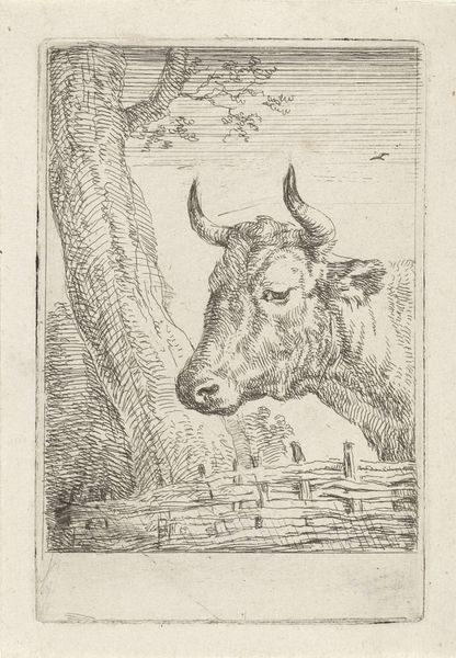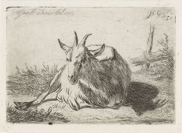 Editor: So this is “Liggende koe van voren gezien,” or “Lying Cow, Seen From the Front,” an etching by Jacobus Cornelis Gaal, created in 1864. I’m immediately struck by the cow's gaze – it's so direct and almost confrontational. What visual language or symbolic meaning do you see embedded within this unassuming pastoral scene? Curator: I notice how the direct gaze connects with a long tradition of animal portraiture where the subject stands as a proxy for human experiences. Think about the sacred cow in many cultures – its very presence evokes ideas of sustenance, fertility, and perhaps, in this etching, a grounding connection to nature during a rapidly industrializing era. What stories do those symbols evoke? Editor: That's interesting. So you're suggesting the cow becomes more than just a farm animal; it's a stand-in for deeper cultural anxieties? Curator: Precisely! Consider the positioning, too. The low vantage point puts the viewer in a subservient role, emphasizing the animal's dominance. Is this an echo of ancient pagan symbolism where animal worship served a social and spiritual purpose? Are there visual echoes that support that idea? Editor: Now that you point it out, that angle does create a feeling of reverence…almost like a deity. It also looks like the cow is reclining, like some kind of Greek God, in its dominion! And its placement against a nondescript landscape furthers the contrast. I guess the ordinary is made extraordinary, then, by a whole history of symbolic meanings. Curator: Exactly. It shows that even simple images carry echoes of centuries, waiting to be deciphered and felt. Perhaps even now it resonates in different ways as we face new environmental and social challenges. What’s your impression now? Editor: I see the value and deep implications of studying symbolic messaging, in seemingly simple scenes. Curator: Indeed, this etching gives us insight not only into a specific time but also into our evolving relationship with nature, captured in enduring symbols.