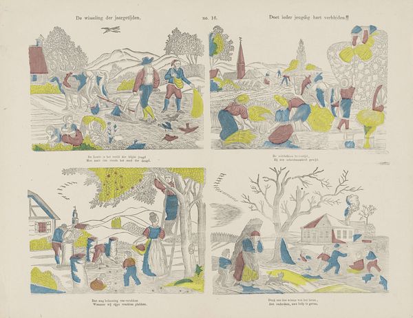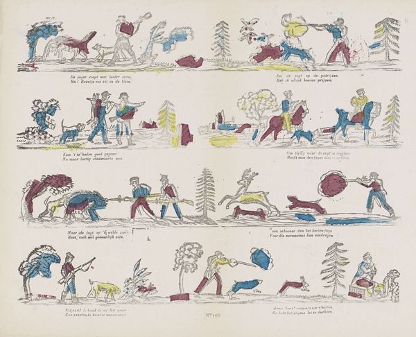 Editor: This is *Jachttaferelen* or Hunting Scenes, a watercolor print by Lutkie & Cranenburg made sometime between 1848 and 1881. I find its style really interesting, especially how naive and cartoonish it seems, which is pretty different from other Dutch Golden Age works. What do you see in this piece? Curator: The deliberate naïveté offers a fascinating lens through which to view 19th-century Dutch society and its relationship with nature. The "Hunting Scenes" remind us that the Dutch Golden Age, though celebrated, rested upon complex social and environmental structures. The scenes aren’t mere depictions of sport; they represent power dynamics between humans and animals, but also between different social classes. Editor: How so? Curator: Hunting was often a privilege of the elite. Do you notice the ways in which the hunters are portrayed, their postures, their attire, and even the landscape they inhabit? What do they suggest about the accessibility and control over resources at the time? Editor: Now that you point it out, they all do seem similarly well-dressed, suggesting a degree of affluence or a shared social status amongst the hunting group depicted. It’s also interesting how detached the humans are in posture in respect to the hunted animals in each depicted scenario. Curator: Precisely! The scenes become a tableau of dominance, reinforcing a certain hierarchy that extends beyond the hunt. So the apparent innocence is deceptive. By embracing this deceptiveness, how can we invite viewers to consider their own role in perpetuating social structures or challenging conventional aesthetics? Editor: So, by understanding the historical context and social commentary embedded within it, the artwork’s value goes far beyond being a collection of "naïve" drawings. Curator: Indeed, it becomes a mirror reflecting the values and biases embedded in our histories and the present. It certainly challenges us to think differently about artistic representations of gender, class, and power.