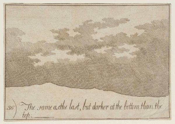 Editor: Here we have Alexander Cozens' "22. Half Cloud Half Plain..." from the Tate Collection. I’m immediately struck by its almost diagrammatic quality; it feels more like a scientific study than a landscape. How do you interpret this work? Curator: It is interesting how Cozens combines artistic expression with scientific observation. Consider how the political and intellectual climate of the Enlightenment valued empirical study. Do you think this image reflects a societal desire to classify and understand the natural world? Editor: That's a great point. It's like he's dissecting the sky. I never thought about it in relation to the Enlightenment. Curator: Exactly! By reducing the landscape to its essential components, Cozens invites us to analyze its structure and, perhaps, our relationship with nature itself. Editor: I see it differently now, thanks!