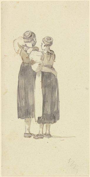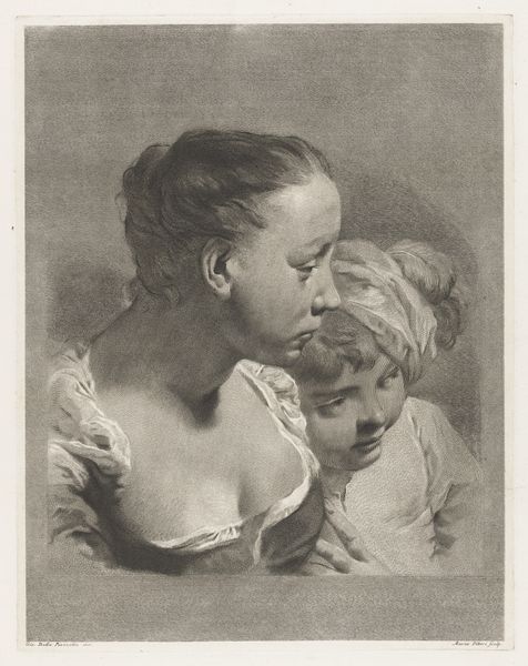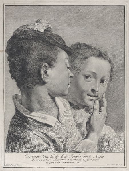 Curator: Looking at this print, made in 1743 after a drawing by Giovanni Battista Piazzetta, it depicts a tender embrace between a young man and woman. The medium is engraving. Editor: It's striking! There's something intensely melancholic about it, even though it portrays affection. The limited tonal range throws these long necks and gazes into high relief – makes me wonder, what’s the backstory? Curator: The print is titled "Plate 6: A young man embracing a girl; from 'Icones ad vivum expressae'," now held at the Metropolitan Museum of Art. Considering the period, this kind of intimate portrayal was certainly intended for circulation and admiration amongst a select audience, displaying affection in a manner that fits neatly within very controlled societal mores. Editor: Mmm, controlled is the word! Even the embrace feels somehow... restrained, formal. There's this powerful sense of holding back, a yearning communicated through the averted gazes. You see a lot of baroque art using these devices to give hints. Maybe, in their avoidance, lies some truth. Like whispers. Curator: Absolutely. The engraving technique itself, with its precise lines, almost amplifies this sense of controlled expression. And remember that prints like these facilitated the dissemination of artistic styles and ideals of the era. The Met houses it now, but who handled it and where it hung originally opens this art for socio-political readings around visibility, and wealth and gender and devotion. Editor: It feels like we’re witnessing a fragment of a story, a fleeting emotional encounter rendered permanent. It asks so many unspoken questions. Is it pure innocent connection or something far deeper, more complicated? The stark contrasts also somehow magnify the piece for me... Curator: The charm here comes from all that space it opens. Editor: A beautiful open-ended poem in visual form. Curator: Precisely. A glimpse of Baroque sensibility filtered through our modern gaze.