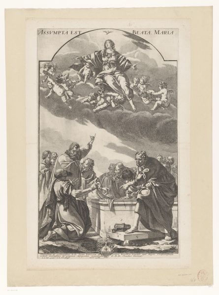 Étienne Gantrel created this print, "Miracle of Saint Francis Xavier," sometime in the late 17th century. During this period, the Catholic Church wielded considerable influence, shaping not only religious life but also art and culture. Gantrel's print reflects the era's emphasis on religious subjects and the power of the divine. The image depicts Saint Francis Xavier, a prominent Jesuit missionary, performing a miracle. We see him amidst a group of onlookers, with a celestial vision unfolding above. This scene is not just a depiction of a religious event; it's a narrative imbued with the cultural and spiritual values of its time. What did it mean to witness or experience a miracle in the 17th century? How did it affirm or challenge existing social hierarchies? Notice how the composition reinforces the saint's power and the miracle's awe-inspiring nature. Consider the emotional impact of such an image on viewers then and now. Gantrel invites us to contemplate faith, power, and the human experience within a religiously structured world.