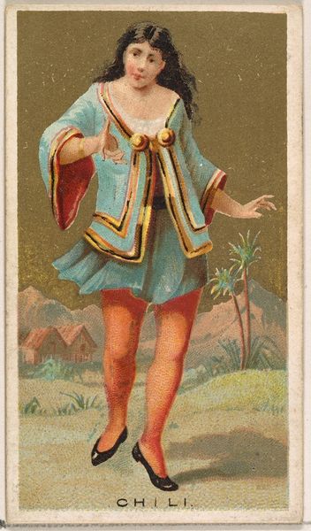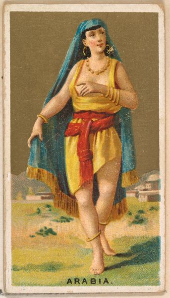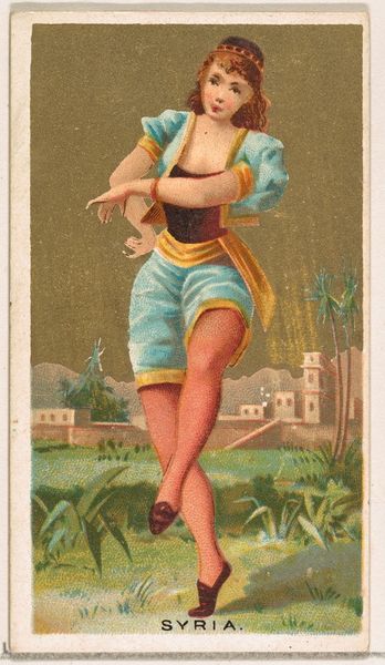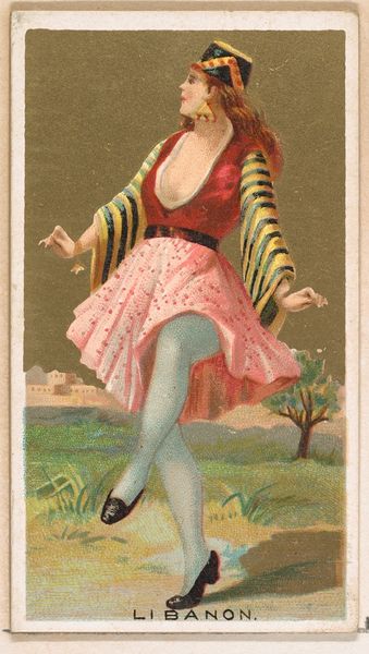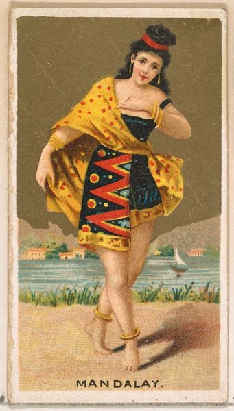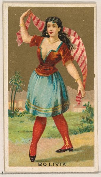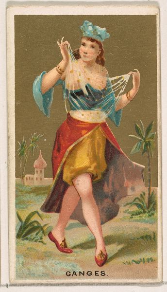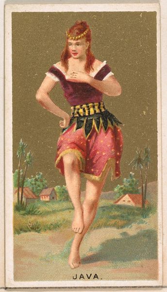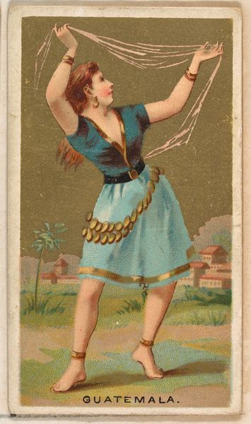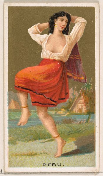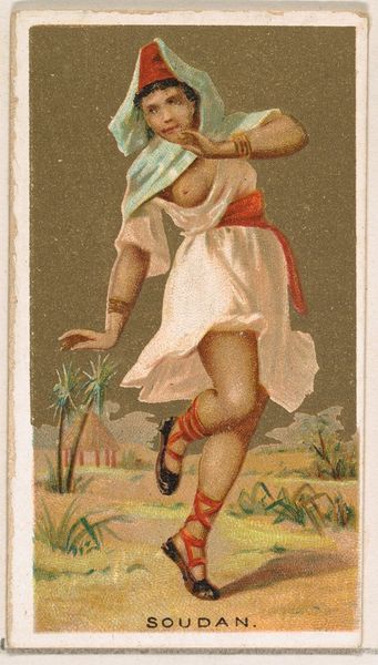 This is a chromolithograph titled 'Borneo,' created around the late 19th century by Wm. S. Kimball & Co., as part of their 'Dancing Girls of the World' series. The card presents a dancer in mid-performance, set against a backdrop that merges exoticism with commercial appeal. The dancer’s pose, with one leg raised, creates a dynamic tension, further emphasized by the swirling fabric that seems to defy gravity. The composition is carefully arranged, using the dancer's body to bisect the card, drawing the eye between the foreground and the stylized landscape. The tension and the composition highlights the construction of identity. Here the dancer is coded through clothing and exotic scenery. It's a constructed image aimed at a Western audience. In this way, the card serves not just as a commercial object but as a signifier of cultural exchange and power dynamics, reflecting how images mediate our understanding of the world. The formal qualities invite us to question how we assign meaning to cultural symbols.
