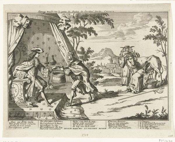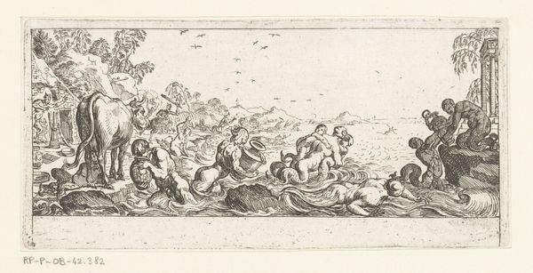 Curator: Ah, the magic of a sweeping landscape, wouldn't you say? Before us, we have an engraving titled "Landschap met paard en wagen," or "Landscape with Horse and Cart," likely crafted between 1612 and 1652. The artist, sadly, remains anonymous, a secret keeper of the Rijksmuseum’s collection. It's that classic blend of etching and engraving... it just oozes Northern Renaissance vibes with a touch of Baroque drama, doesn't it? Editor: Absolutely. What strikes me immediately is the tension. We have this idyllic setting with a waterfall and a hilltop town, but then your eye is drawn to the bottom right corner: the looming cross, a moment of quiet worship, or perhaps suffering. The journey feels more ominous than pastoral. Curator: Ominous, yes, perhaps. But for me, the allure lies in the meticulous detail. See how the engraver rendered the foliage of the trees or the distant mountains... there is so much to linger over, even on such a small scale. The hustle and bustle of daily life against the grand theatre of nature, quite a contrast to chew on. Editor: Indeed. And the composition really drives home the class divisions of the time. A merchant-type figure leads his horse-drawn carriage through this landscape, while peasants either work on or pray by a roadside shrine. These are landscapes that foreground labor, inviting us to consider the role of exploitation in the era's artistic production. Curator: You’re right, and it’s funny how landscapes of the era tended to romanticize work! Even here, with a touch of piety at the cross, it feels…contained. Less an expression of struggle, more like a piece of the scene. Still, there's a kind of peaceful resignation, as though it were a natural part of life. Perhaps the artist wanted to find beauty within the existing system? Or critique the normalisation of these hierarchies. It really pulls you both ways! Editor: Yes, precisely that push and pull. And I can't help but notice the dark cave in the lower left with two figures. Perhaps even evoking the “cave” of Plato? So it seems, this could reference humanity’s incomplete and often distorted understanding of the "real" world… something to keep you awake at night. Curator: You know, pondering such symbolism amidst this serene tableau definitely tickles my brain. So much encoded within such subtle strokes... It transforms what might seem like a pretty picture into something that pricks at your consciousness, which, if you ask me, is a good job, no matter the time period. Editor: Precisely. And isn’t that the best kind of art? It speaks across centuries because it has something urgent to say about our own messy, unequal present.