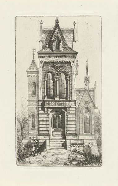 Henry Farrer created this print of St. Paul's Chapel in New York using etching, a process that allows for exquisite detail. The chapel is presented frontally, with a steeple that rises centrally against the sky, flanked by mature trees. Notice the tonal gradations achieved through hatching, which give depth and texture to the trees, the building's facade, and the surrounding graveyard. The composition functions as a study in contrasts. The verticality of the chapel's steeple is juxtaposed against the horizontal spread of the graveyard, creating a visual dialogue between aspiration and earthly concerns. The textures vary from the rough bark of the trees to the smooth stone of the chapel, engaging the viewer in a semiotic interplay between nature and human construction. Farrer subtly destabilizes traditional landscape art by merging architectural portraiture with natural scenery. The etching does not offer a singular view but rather suggests the complex layers of history, spirituality, and material existence.
