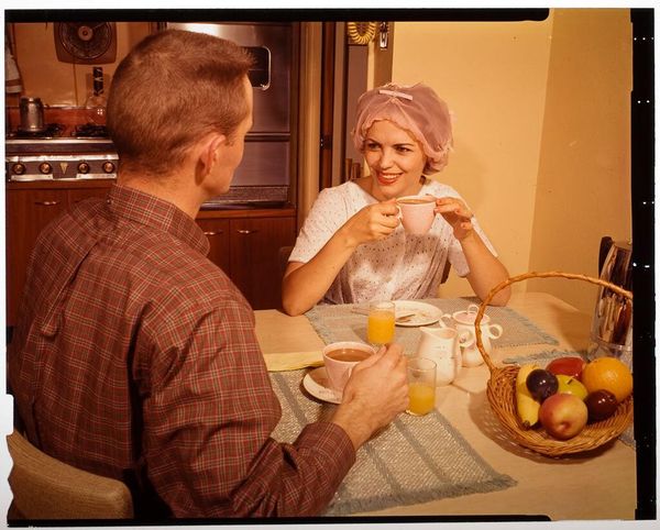 Curator: This is an untitled photograph by Jack Gould, currently held at the Harvard Art Museums. It measures approximately 12 by 10 centimeters. Editor: It's quite domestic, isn't it? The woman, that bright checkered shirt, all very mid-century kitchen iconography. Curator: Indeed. Observe how Gould captures the labor of food preparation. The hand-crank meat grinder, the raw ingredients...it speaks to a specific time and place of manufacturing and food consumption. Editor: The meat grinder itself could be read as a symbol of transformation, of turning raw materials into something else, something… perhaps more palatable? Curator: Or consider the labor implied by the hand crank – the effort put into everyday tasks, very different from pressing a button on a modern appliance. Editor: I see, so the materiality of the domestic sphere, the apparatus of 1960s kitchen work… Curator: Precisely. It emphasizes the physical processes often hidden in contemporary food culture. Editor: It all feels so…wholesome, despite the raw meat. It almost makes me nostalgic for a time I never knew. Curator: A potent reminder of the unseen work behind the meals on our tables. Editor: It brings an interesting perspective to ordinary life.