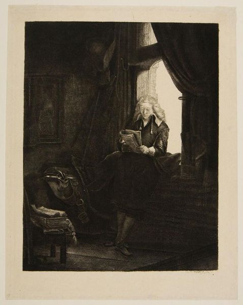 Editor: This is Rembrandt van Rijn’s "Jan Six," an etching from 1647. It's strikingly intimate, catching this man in a moment of quiet contemplation. What do you see in this piece, beyond a simple portrait? Curator: The light, first and foremost, guides us. It pours in from the window, illuminating Jan Six and the text in his hands. Windows, and light itself, are persistent symbols of revelation, of clarity, in Dutch Golden Age painting. What do you think he's reading, and how does it impact our understanding? Editor: Perhaps a poem? His gaze is so focused, almost…searching. Maybe he is looking for something to change his outlook or searching for solutions. Curator: Precisely. And consider his posture, leaning against the window frame, seemingly caught between the interior space and the outside world. Is he lost in thought, seeking inspiration? Does the book offer a metaphorical doorway? In iconography, thresholds like these often mark transitions. Do you see any other visual motifs that support this idea? Editor: The room itself seems full of books and papers, hinting at a life of the mind, or an unraveling case with clues, while the partially opened window beckons. Maybe there’s a contrast between intellect and action, internal reflection versus external experience? Curator: Exactly. Jan Six was a patron of the arts and close to Rembrandt. The print therefore isn’t just an aesthetic depiction but also represents a powerful connection between the two artists. Moreover, the curtain is pulled back; there is an idea of the performative in relation to truth and authenticity. What story do you think Rembrandt wanted to tell? Editor: He wanted to show his friend as learned, engaged, caught between thought and reality. It seems there’s so much more depth beneath the surface than a first look reveals. Thank you for unveiling such important visual cues. Curator: It highlights the importance of exploring the narrative power that images possess. Thank you for noticing, remembering, and thinking critically.