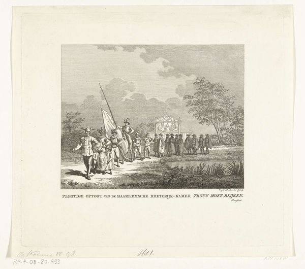 This print, Inspectie van de Haagsche Schutterij, by Desguerrois & Co., made around 1830, presents a scene dominated by horizontal lines and a monochromatic palette, instilling a sense of order and formality. The composition unfolds as a series of layers, from the assembled townsfolk on the left to the regiment of mounted figures advancing towards the stark buildings in the background. This structured arrangement emphasizes the social hierarchy and the controlled display of military readiness. The interplay between light and shadow accentuates the texture of the landscape and the uniforms, adding depth to the otherwise restrained aesthetic. Semiotically, the image operates through codes of power and civic duty. The regiment's inspection suggests not only the maintenance of order but also the performative aspect of public life. The linearity and controlled perspective can be seen as visual manifestations of societal structures, reflecting the period's emphasis on order and control. The somber tones and rigid composition invite us to consider how art constructs and reinforces cultural values.