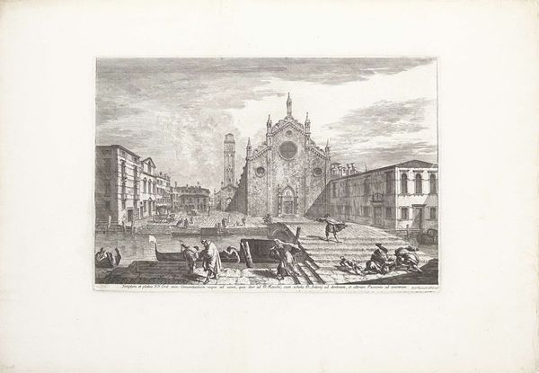 Curator: This is Michele Marieschi's "Campo Santi Giovanni e Paolo te Venetië," an engraving from 1741 now housed in the Rijksmuseum. Editor: My initial impression is one of bustling yet orderly life; the intricate lines bring to mind a stage where everyone performs their roles with remarkable synchronicity. Curator: Indeed, it encapsulates 18th-century Venetian life but let's delve into the deeper narrative at play. Marieschi captures the intersectionality of commerce, faith, and aristocratic power within this public square. How do you read the symbolic architecture? Editor: Well, the basilica obviously looms large, representing not only the spiritual heart of Venice, but it stands beside an equestrian statue. It implies secular, martial power sanctioned, or perhaps even overshadowed, by the Church. I also note the deliberate portrayal of daily activities. Are they types rather than individuals, perhaps? Curator: Exactly! This hints at the rigid class structures dictating access and representation in Venetian society. Note the marginalization of certain figures in the shadows. Are they intentionally depicted or made subservient by the composition? The choice to render this public space in such a meticulous manner shows how power is maintained through controlled visibility and limited avenues for dissent. Editor: And if you shift focus to the Grand Canal and those smaller structures along it—one senses the omnipresence and the power of Venice, so interwoven with every facet of life. It seems less accidental and much more central. Curator: A keen observation, showing Venice literally intertwined. Furthermore, who exactly benefits from such aesthetic projects? By visually celebrating the structures of power, artwork such as this normalizes existing inequities and may erase collective struggles. The very decision to create this highly structured print itself constitutes an ideological statement! Editor: But at the same time, these prints become part of Venice's self-fashioning as an entrepot for luxury and for a globalized vision. We have, then, a story far more complicated than surface appearances allow. Curator: A vital complexity which underscores that an engraving may not present mere reality but can function as both social critique and reinforcement of established orders. Thank you. Editor: My pleasure, uncovering the multiple layers reminds me to always question visual certainties in the arts.