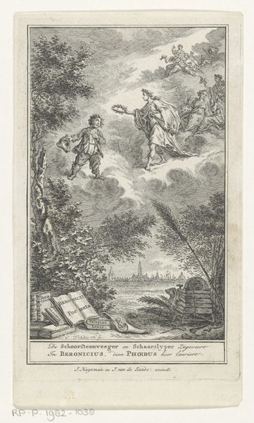 "Fabel van Phoebus en Boreas" was crafted by Johann Heinrich Meil the Elder, during an era grappling with the power of enlightenment ideals and the revival of classical themes. Here, we see the artist's interpretation of a scene where Phoebus, the sun god, clashes with Boreas, the god of the North Wind. Phoebus rides his chariot, pulled by horses, while Boreas struggles beneath him, engulfed in clouds. In a smaller depiction, a figure on horseback rides through a landscape below, possibly representing humanity’s experience of these divine forces. Meil employs a common theme in art history: the struggle of opposing forces. The print invokes questions about how power, nature, and humanity intersect in times of change. It leaves us to consider the enduring tension between enlightenment and chaos.