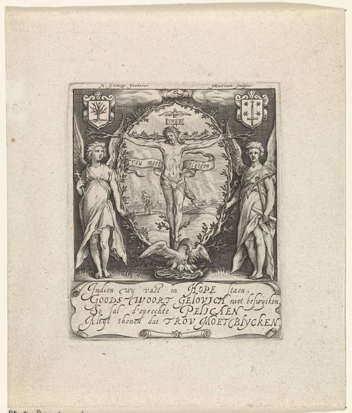 Curator: Oh, yes, Langweer's "Pelikaan die zijn jongen met eigen bloed voedt" from 1661. What a potent image rendered in delicate engraving. I see an allegory so raw, so vulnerable, it practically whispers from the paper. What strikes you about it? Editor: I’m immediately drawn to the pelican at the center. It’s a striking image—noble, yet somehow tragic, with that wreath around it. The figures to each side almost seem like afterthoughts. I’m curious, what layers of meaning were engravers aiming for? Curator: Ah, that central image! For centuries, the pelican piercing its own breast to feed its young has symbolized ultimate sacrifice—selfless love and, perhaps most potently in 17th-century Europe, Christ's sacrifice. See how it nests within that garland—it elevates it to a sign. The figures represent love and knowledge as if competing as guiding spirits. Think of it as a visual sermon, each element carefully chosen to evoke specific emotions and moral contemplation. Does that framework change how you perceive the characters at all? Editor: Definitely! Seeing it in that historical context makes it so much richer. They now feel less like afterthoughts and more like dueling influences in life. Curator: Precisely! This wasn’t just decoration; it was a way to impart crucial values. It makes you wonder about the power of such images back then, doesn't it? A far cry from our fleeting digital age. Editor: It really does! Thinking about its impact then versus now is really compelling. Thank you.