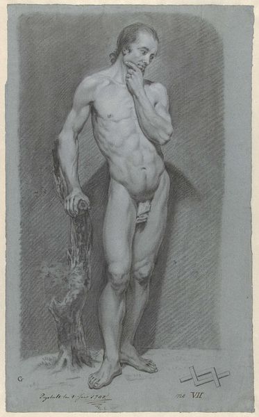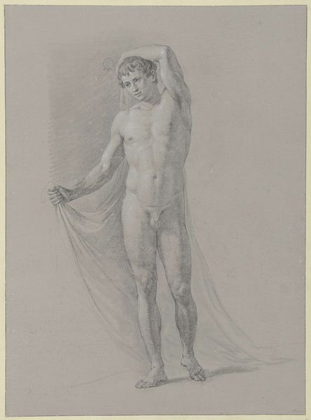 Curator: Before us we have Jean Grandjean's 1781 pencil drawing, "Studie naar het standbeeld genaamd de Albani Antinous," which translates to "Study of the statue called the Albani Antinous." Editor: It’s strikingly melancholic, isn’t it? The figure’s downcast gaze and relaxed posture evoke a sense of profound sadness or resignation. Curator: It is important to remember the cultural obsession of that time with classical antiquity. Grandjean, like many artists, would have been drawn to Roman sculptures like the Antinous as models of ideal form and beauty, reflecting Neoclassical ideals. These studies were also critical to establishing academic training and taste. Editor: Absolutely. Antinous himself has become such a potent symbol, hasn't he? Not just as youthful beauty, but also of imperial favor, tragic loss, and enduring love since Emperor Hadrian deified him after his early death. That weight permeates every representation of him. It seems he’s forever caught in that youthful, grieving posture, representing sorrow and idealization all at once. Curator: Indeed. Consider the circumstances of its creation. Grandjean's drawing would have been created as part of an educational framework and within the prevailing social discourse of his time. Art academies reinforced hierarchies. Editor: The delicate rendering enhances that sense of fragility. He embodies something fleeting—youth, beauty, life itself—as if caught in a state of perpetual mourning for his own lost potential. This tragic symbolism cemented Antinous as a kind of eternal adolescent. Curator: These artistic depictions can often whitewash a complex, historical person and also the complicated power dynamics between Hadrian and Antinous. It’s crucial to interrogate the politics embedded in the image. This drawing represents the larger power structures of the art world then. Editor: Agreed. And now I'm thinking about what’s missing – what's been intentionally omitted? The active queering of traditional classical male art representations? Curator: Precisely, viewing art through a historic lens enables understanding not only art history, but political and social contexts. Editor: This artwork makes me curious about how time reshapes our perceptions and associations connected with images and people.