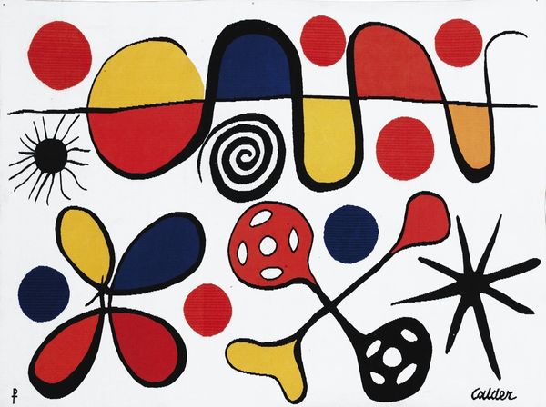 Editor: We're looking at Alexander Calder's "Orbs and Crosses," created in 1967 using acrylic paint. It strikes me as quite playful, almost like a child's drawing with its bold shapes and colours. What do you see in this piece? Curator: Beyond its seemingly simple composition, I see a reflection of the sociopolitical currents of the 1960s. Calder, known for his mobiles that defied traditional sculptural form, here flattens and simplifies his visual language. Considering the historical backdrop of the Civil Rights Movement and the Vietnam War protests, does this abstraction hint at a societal unraveling, a questioning of established structures? Editor: That's interesting! I hadn’t considered that at all. I was mainly thinking about the colours and shapes. Curator: The choice of vibrant yellows, reds, and oranges might be seen as a pushback against the perceived greyness of traditional power structures. And those “crosses”, positioned alongside more fluid "orbs”, what societal tensions do you think that they signify, the rigid versus the fluid? The oppressive versus the liberating? Editor: I guess I thought of the crosses more as design elements. But seeing them as symbols of structure makes sense, especially in the context of the era. Curator: Precisely. And how do you interpret his signature appearing so prominently, almost like another element within the composition? Could that be a statement of the artist's identity in the face of cultural upheaval? Editor: So, this isn't just a cheerful abstract piece. It’s loaded with the anxieties and the spirit of the 60s. Curator: Exactly. It’s a reminder that even the seemingly simplest forms can hold profound reflections of their time. Editor: I will definitely look at abstract art with a new perspective from now on!