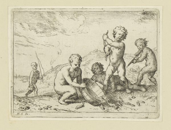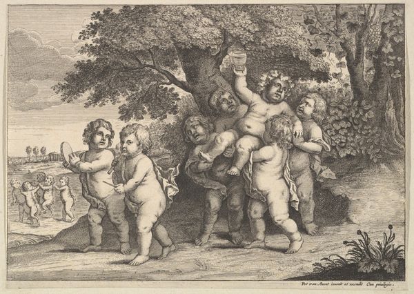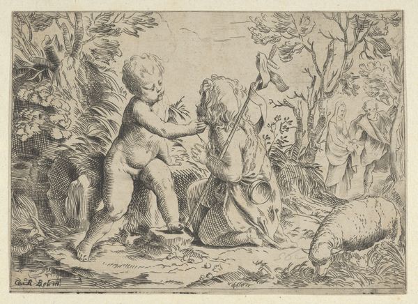 Guido Reni made this print, Young Saint John the Baptist kneeling before the infant Christ, sometime in the early 17th century using etching. Look closely, and you can see it is made up of thousands of tiny, precise lines. Etching involves coating a metal plate with a waxy ground, then drawing through the ground with a needle to expose the metal. The plate is then immersed in acid, which bites into the exposed lines. The longer the plate stays in the acid, the deeper the lines. The ink adheres to the etched lines, and the smooth surface of the plate is wiped clean to create the image. This process allowed Reni to produce multiple copies of his artwork. Prints like this were relatively inexpensive, and played a key role in disseminating artistic ideas. Consider, too, the labor involved in creating these prints, and how different it is from the more singular act of painting.