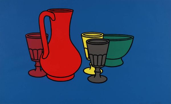 Editor: This is Tim Mara's "Can and Bowl". The strong contrast between the green bowl and red background, with the watering can below, creates a fascinating visual division. What do you make of the composition? Curator: Note the stark chromatic contrast achieved through the bipartite division, a bold visual statement. The artist uses the interplay between the objects' forms and their respective grounds to create tension. Consider the materiality, too; the sheen of the watering can against the matte bowl. Editor: That's a great way of putting it. I hadn't really thought about the textures individually. Curator: Mara seems interested in using formalism to study the spatial relationship between these objects; each form contains unique, almost self-referential qualities. Editor: It's almost like the painting is drawing attention to the simple beauty of these functional objects. Curator: Precisely! It's a work that invites us to dissect its structural elements and appreciate the artist's vision.