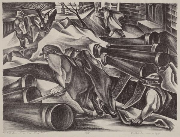 Curator: Letterio Calapai's "8:30 Express", created in 1944, strikes me as a powerfully condensed narrative of urban life during wartime. Editor: The dense black and white composition certainly evokes a strong feeling of claustrophobia and urgency. The use of line and shadow is incredibly dramatic. Curator: It's more than just visual drama; the tightly packed figures convey the intense social pressure and perhaps the anxiety of the era. Look at how Calapai uses the symbolic weight of the crowd – representing a microcosm of society. There is something very suggestive in this figuration. Editor: From a purely formal perspective, observe how the artist utilizes contrasting values to create depth. The sharply defined forms and textures pull the viewer into the crammed space of the train. It reminds me of German Expressionist woodcuts... Curator: I think that the image does suggest an almost allegorical rendering of communal life, and perhaps something of shared experience as collective trauma. You could consider this as a depiction of individuals losing themselves in a crowd, a symbolic dissolving of individual identities within something bigger. Editor: The way the chains bisect the image, they introduce a subtle dynamic, segmenting and binding simultaneously. We cannot ignore how that bold textural choice draws the eye. And think about it formally as both rhythm and compositional weight. Curator: Precisely, there's also a powerful memory ingrained in that kind of crowding. It takes on a significance as an embodiment of movement, transition and the hopes, anxieties, and perhaps fears that shape a generation. The train carriage as a shared symbolic experience. Editor: Calapai's graphic rendering of the morning commute then transforms from simple scene into a fascinating study in the tensions between space, texture and the emotional weight of the time. Curator: The power of the image truly resides in its potential for encoding so many aspects of urban social existence. Editor: Agreed. It makes me consider the potency of a relatively straightforward set of artistic decisions.