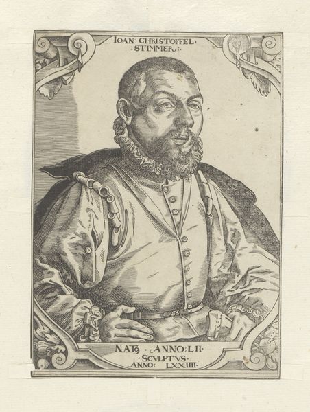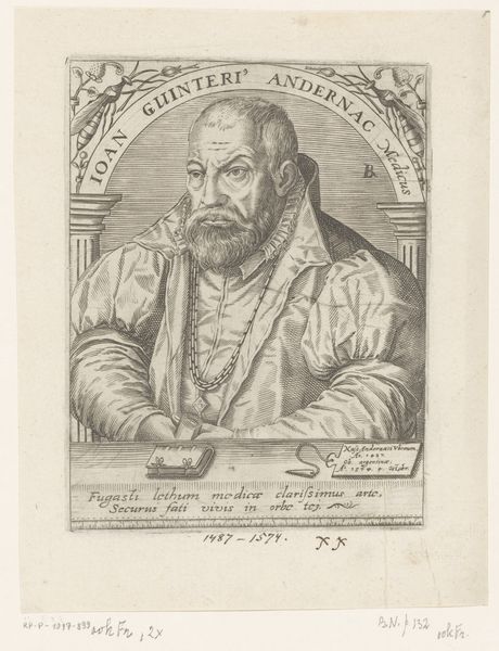 This is an undated portrait of Georg Marius, made by an anonymous artist using engraving. The structure of the image presents a formal, almost scientific rendering of the subject, framed by an ornate oval border teeming with symbolic elements and text. The meticulous lines of the engraving create a rich texture, defining Marius’s features and clothing with precision. Note how the artist uses hatching to model form and create tonal variation, effectively conveying the texture of the sitter's beard and ruff. The inscription lends a semiotic layer, embedding the portrait within a specific cultural and intellectual context, identifying Marius by name, profession, and status. The composition, with its emphasis on symmetry and detail, reflects a desire to capture not just a likeness, but also the essence and social standing of the sitter. Consider how the structure and form challenge fixed meanings, engaging instead with new ways of thinking about representation and identity through meticulous artistic craft. The overall effect is of a carefully constructed image, where artistic form and symbolic content intersect, capturing a moment and a man within the intricate web of history.