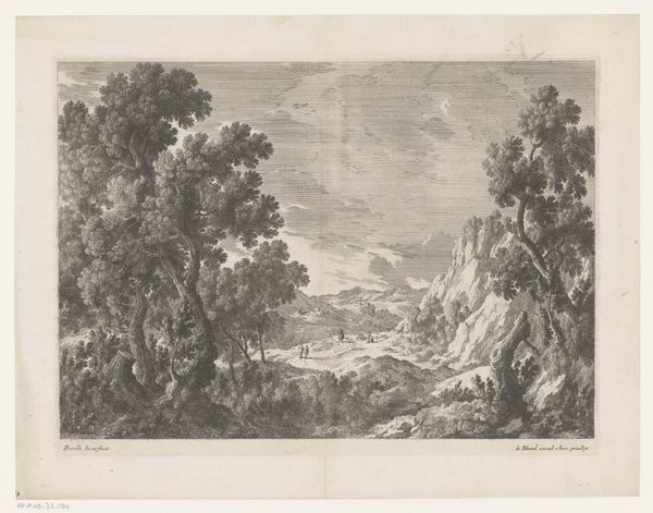 Curator: Before us hangs Nicolas Perelle's "Landschap met knielende figuur bij een ezel", an engraving on paper that likely dates to somewhere between 1613 and 1695. The artwork resides here at the Rijksmuseum. Editor: My initial impression is of balanced tension. The sharp, precise lines used to create the lush landscape versus the soft, almost hazy sky gives it a very intriguing compositional dichotomy. Curator: Indeed, the precision contributes to its Baroque grandeur, which, paradoxically, clashes a little with the intimate scene of the kneeling figure and donkey in the foreground. Do you think there's a narrative at play that balances that tension? Editor: Well, consider the composition itself. The tree on the left mirrors the cliff on the right, each echoing the other in size and shape. This parallelism creates a sense of equilibrium that permeates the image, despite the sharp textural shifts and contrast between shadow and light. Curator: But what of the donkey? The iconography of a humble creature in such proximity to a figure who's possibly kneeling could suggest the burden carried through life, or even perhaps be alluding to some classical or biblical motif, wouldn't you agree? Editor: Potentially. However, I think there’s value in understanding how Perelle’s lines and shades create varying visual weight across the surface of the picture. How they balance and offset each other to define the perspective. Look closely— see how the architecture nestles against the cliff face. It is both emphasized, and made subtle, by its construction. Curator: Ah, yes. Perhaps Perelle sought to create more than a pleasing image—maybe it's a meditation on humankind's place within the landscape, burdened yet blessed? The ruins, like the donkey and the figure, could be more than scenic details. They seem integral to the historical consciousness imbued in the image. Editor: Whether we interpret the scene historically or just consider it as a striking landscape print, its subtle complexities definitely continue to capture one's gaze, centuries after its creation. Curator: I think that our exchange has emphasized the image's cultural resonance. Perhaps, that has something to say about art's continuing power as a means of contemplating shared human experience, in ways that might both delight and disturb.