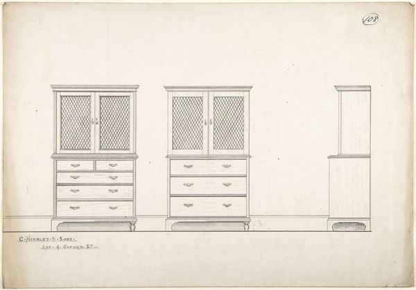 Curator: Today, we are examining “Chest of Drawers, from Chippendale Drawings, Vol. II,” an etching by Thomas Chippendale dating to 1753. Editor: It's surprisingly detailed, almost architectural in its precision. The lines are clean, the symmetry impeccable. There’s an understated elegance, even in its monochromatic presentation. Curator: Indeed. Chippendale was known for blending various styles. In this piece, we see the emerging Neoclassical influence, with a focus on balanced proportions and a revival of classical motifs. Consider the delicate rendering of the cabriole legs and the geometrical intricacies within the glazed cabinet door. It’s all about line. Editor: Yes, the use of line is paramount. It's a showcase of form, prioritizing function but undeniably artistic in its approach. It reflects, I think, the growing affluence of the merchant class, looking for refinement without ostentation. Chippendale met their needs. Curator: Precisely. Furniture in this era wasn't merely functional; it reflected social aspirations and status. The rise of consumer culture saw the reproduction of pattern books, like Chippendale's, leading to wider access to fashionable designs, allowing the middle classes to emulate aristocratic tastes, with simplified detailing, of course. Editor: And there's an aspirational element inherent in a drawing like this. It presents not just the object itself, but also a vision of sophisticated domesticity, influencing taste and creating desires. You have to remember these were originally purchased, often by cabinetmakers, to instruct them. Curator: Furthermore, the format – the print – itself played a crucial role in disseminating aesthetic ideals and establishing a sort of design vernacular. Chippendale became a brand, influencing cabinet makers throughout Britain and beyond. Editor: The formal qualities, therefore, speak volumes about broader shifts in 18th-century society. What first seemed like just a drawing of furniture actually speaks volumes of status and societal changes, quite intriguing. Curator: Precisely, it is this synthesis of visual structure and historical context that makes examining these drawings so compelling. The detail and form give clues of the world for which it was designed.