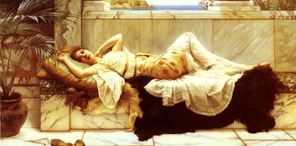 Curator: Lawrence Alma-Tadema's "Water Pets", a painting that invites us to consider not only its aesthetic qualities but also the labor and material conditions that brought it into being. Editor: It exudes a serene stillness. The light, the mosaic floor, and the languid pose of the woman all contribute to an atmosphere of tranquility. What details stand out to you? Curator: Immediately, it’s the marble mosaic floor that seizes my attention; the immense labor that would have been required, particularly within the context of the broader artistic and artisanal practices. This highlights the artist's material understanding. Editor: Absolutely, I'm struck by the woman's gaze—it hints at introspection, doesn't it? The composition draws your eye across the detailed mosaics, finally resting upon the pensive figure. One begins to ponder her role within this tableau of domestic leisure. Curator: Domestic leisure is key here! Alma-Tadema's art often presents an idealized vision of the past. How complicit are we, as viewers, in consuming such imagery, often disconnected from its production? Editor: That's a piercing question. Perhaps, the painting reveals underlying gendered assumptions tied to leisure and spectatorship. Whose labor truly enables these scenes of supposed ease? And who is excluded from it? Curator: Consider also the material itself—oil on canvas. Its very substance is part of a history steeped in particular markets and networks of trade, all of which affect the final form of the artwork. How did those materials come together? Editor: A crucial observation. By recognizing the many unseen elements surrounding "Water Pets", we allow its creation to connect broader histories, perhaps prompting viewers to confront the power relations within the work, both explicit and latent. Curator: Indeed, we must look at these beautiful works critically. What labour went into the artworks? Whose stories are marginalized or silenced within Alma-Tadema’s constructed past? Editor: I find myself lingering over its portrayal of Roman life, reminded that these images reinforce narratives about wealth and luxury, and inviting inquiry into those stories we overlook. Curator: Alma-Tadema’s piece asks for a multifaceted perspective. One cannot merely absorb it but has to examine how labor, materials, and the very act of viewing contribute to the painting's value. Editor: For me, this encounter underlines the enduring role of art as a mirror, allowing insight to cultural ideals that can reveal our beliefs about gender, history and even class disparities, prompting both contemplation and discussion.