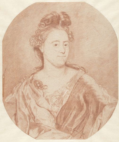 Editor: This is "Buste van een jonge vrouw" by Godfried Schalcken, created sometime between 1653 and 1706. It's a delicate drawing in pen and pencil on paper, housed here at the Rijksmuseum. It's just a head and shoulders of a woman in an oval frame; the composition seems simple, but there's something captivating about the lines. What do you see in this piece? Curator: I am immediately struck by the artist's manipulation of line and form. Consider the use of the oval – it's a classic formal device for portraiture, yet it isolates the figure, intensifying the viewer’s focus on her inherent qualities. Editor: Her inherent qualities? Like what? Curator: Specifically, the play of light and shadow across her face. Note the precise hatching Schalcken employs to define the contours of her cheek and jawline. This creates a three-dimensionality using purely linear means. Furthermore, examine the textile – its delicate rendering implies a luxurious fabric, its folds arranged in a cascade of visual rhythm. Editor: I see, it's not just what it is, but how it's made, and what that construction tells us. The dress is very impressive. Curator: Precisely! Observe also the delicate balance achieved between areas of dense, active lines and the comparatively blank space of the paper. This tension contributes to the overall visual dynamism. Schalcken's intention isn't solely mimetic. The work has a compositional balance that goes beyond a reproduction. Editor: So, it is almost as if he is using the subject matter to test composition and presentation styles? I can see the artist trying to strike a fine balance and to show skill, more than document likeness. Curator: Precisely. Through masterful formal control and technique, Schalcken reveals not merely a young woman but, dare I say, unlocks new levels of composition. Editor: I never considered approaching portraits from a purely construction-first, aesthetic viewpoint. Curator: Focusing on construction first brings forward meaning, the core essence of how visual language delivers communication.