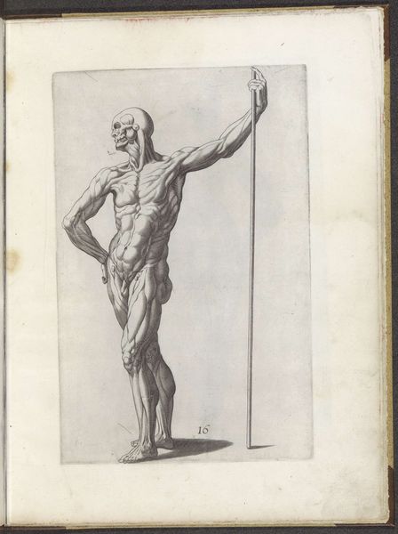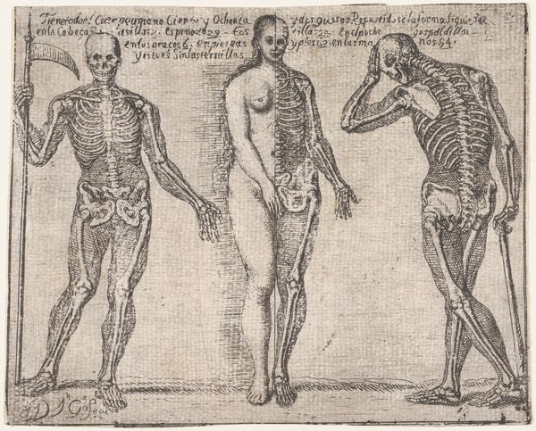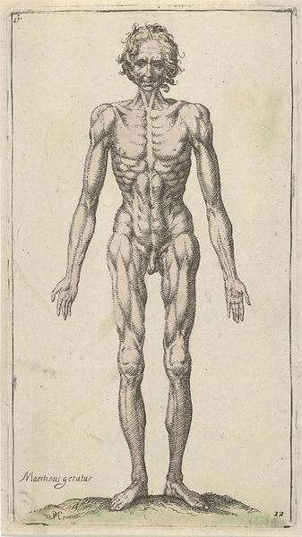 Curator: This is an intriguing, undated piece, titled "Nude with marginal list of various diseases," by an anonymous artist, housed here at the Harvard Art Museums. Editor: My first impression is how strikingly graphic it is—the figure is both anatomical study and, somehow, a map of suffering. Curator: Indeed. Note the stark lines defining the figure and the text organized to create a structural unity. The figure is literally inscribed into the medical discourse. Editor: The lines connecting parts of the body to lists of ailments—mania, vertigo, paralysis—suggest a symbolic association between the physical form and psychological states. Curator: Precisely. The graphic design, with its mix of text and image, transcends pure anatomical illustration. It becomes a symbolic representation of human frailty. Editor: The anonymity adds to the universality of the image. It speaks to timeless human concerns about health and mortality, conveyed through symbolic language. Curator: Absolutely. The piece is not only visually compelling, but also a powerful study in the semiotics of illness and representation. Editor: I find the image’s bluntness quite affecting; it is a powerful reminder of our shared human condition.