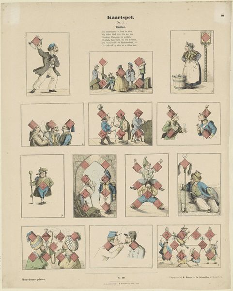 Editor: This is an intriguing print called "Afwisseling in 't ongeluk / Gij zult niet begeeren (...)," created around 1902 by B. Moloch. It looks like a series of sequential cartoon panels, almost like a comic strip. I'm struck by the bold lines and caricatured figures. How do you interpret this work through a formalist lens? Curator: Precisely. Note the rigorous composition of each panel, adhering to a grid structure. This immediately establishes a framework for analysis. Disregarding narrative content, observe how line quality dictates form. See how thick, decisive lines delineate the figures, separating them sharply from the background. The figures themselves are reduced to geometric forms, circles and rectangles predominating. Editor: So, you're focusing on how the artist simplifies and structures the visual elements? Curator: Exactly. And colour too. Notice the limited palette – mostly reds, blues and beige– serving less a representational purpose and more a structural one. Each hue operates as a distinct visual block, contributing to the overall pattern and rhythm across the page. The artist strategically deploys these colours to create emphasis. Consider the chromatic relationship between adjacent panels and within each frame to further elaborate the composition and visual balance of this artwork. How do these relationships modify the artwork's appearance? Editor: It is really fascinating how analysing the basic art elements of line, colour, and structure can unlock a whole new level of interpretation, aside from any story they might be telling. Curator: Precisely! By prioritizing formal elements, we arrive at a fundamental understanding of the artistic intentions and compositional elements of the print.