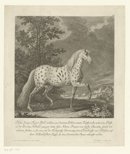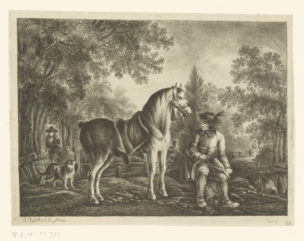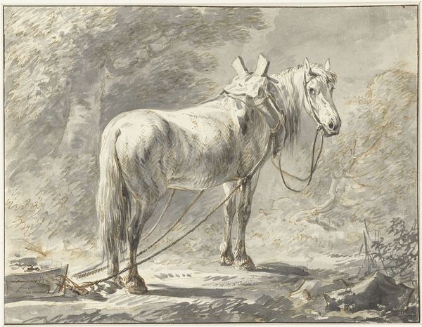 Editor: Here we have Nicolaes Berchem’s oil painting, "Two Horses in a Landscape," created sometime between 1635 and 1683. The dappled horse immediately captures your attention; it feels so intentionally posed against the more subdued landscape. What do you see in this piece, and how might its creation have been influenced by the art world? Curator: Well, it's a compelling window into the Dutch Golden Age. Paintings of animals, particularly horses, were increasingly popular. They weren't just about pastoral beauty. Consider who commissioned such works: often wealthy merchants or landowners wanting to showcase their affluence and status. This image of leisure ties directly to economic power and a sense of idealized country life. What do you think this image is selling? Editor: That makes perfect sense. The carefully positioned horse definitely suggests ownership and perhaps a desire for social elevation. It also connects to my observation that the composition seems so planned. Curator: Exactly. Berchem's strategic composition elevates the subject. While seemingly natural, there is intention behind everything: framing through the tree, the contrasting colours of the two animals. Given the increase in popularity of the Dutch Riding School in this period, do you see these artworks promoting ideals about animal breeding, wealth, or status? Editor: Definitely, that promotion feels inherent in the artistic choices now that I look at it from this socio-economic point of view. I never would have considered the economic underpinnings and their influence before. Thank you! Curator: Of course! Analyzing art with an awareness of historical context really enriches the experience. It reveals that even seemingly simple landscapes can communicate a great deal about power structures and social desires.