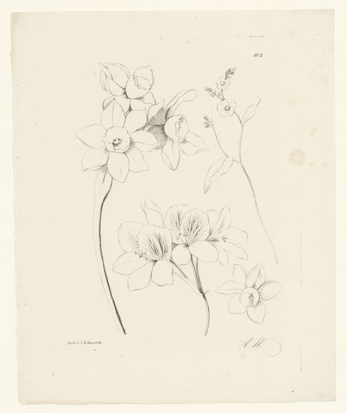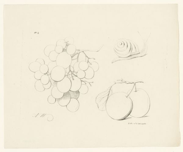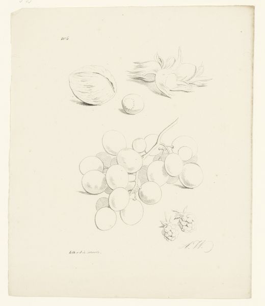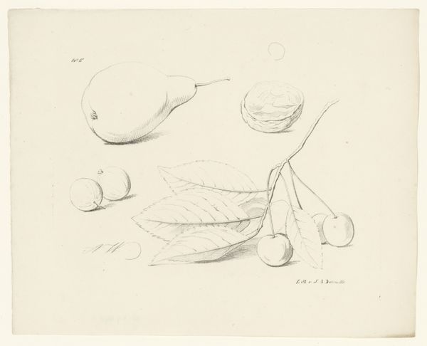 Editor: So, this drawing titled "Bramen, peer en bessen," or "Blackberries, pear, and berries," was created between 1820 and 1833, probably with pencil. It feels so delicate and precise, almost scientific in its observation. How do you interpret this work, focusing on its visual construction? Curator: Considering this work from a Formalist viewpoint, what strikes me most is the artist's skillful manipulation of line and form. Notice the meticulous rendering of each fruit, how the varying line weights suggest depth and volume. Observe the structural composition -- how the clusters of berries create visual counterpoints to the singular pear. Do you see how the negative space around the fruits is just as important in defining their shapes? Editor: Yes, I see it now! The use of light and shadow also emphasizes the roundness of the forms. The texture, too, seems carefully considered. Curator: Exactly. The contrast between the smooth skin of the pear and the bumpy texture of the blackberries adds another layer of visual interest. Also, look at the orientation of the various elements -- branches coming in from the top, pear dominating the lower-left, which helps lead the eye across the entire image. Consider the potential theoretical engagements with this work; for example, structuralism may analyze these individual depictions as building blocks of our overall conception of "fruit." Editor: That's fascinating. I hadn't thought about the texture or the structural layout so much. So it's about the elements and the relationships between them? Curator: Precisely! It’s how the artist utilizes these elements, manipulates line, form and space, that constructs meaning and evokes emotion. It highlights the artwork’s internal logic. Editor: Thank you, that clarifies my perception of it, offering a very different reading beyond just simple representation. Curator: Indeed! There are so many other elements to appreciate once you move beyond what the art represents.