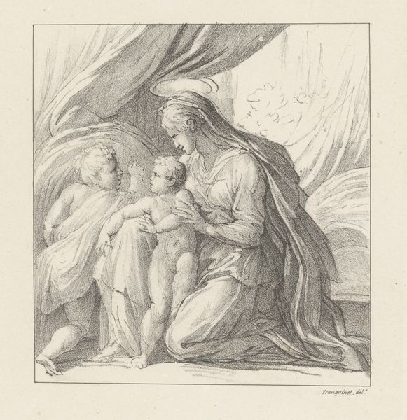 Curator: "Angels and cherubim," a delicate engraving created in 1774 by Violante Vanni, based on designs by Franceschini and Lorenzi, and currently held at the Metropolitan Museum of Art. What are your immediate impressions of the piece? Editor: An immediate reaction to the clustered figures: they seem caught in a state of upward longing, with all gazes lifted—the light seems strategically distributed to emphasize that yearning. Curator: Indeed, that upward gaze is powerfully symbolic. The composition immediately recalls centuries of artistic depictions of heavenly hierarchies and the ascent of the soul. It’s rooted in Neoplatonic ideals, depicting layers of divine beings as intermediaries between humanity and the divine source. Editor: The linear precision achieved through engraving is remarkable. Observe the contrasting density and lightness of the linework that provides textural detail and highlights, creating an airy quality and imbuing these figures with depth and emotion, but consider how that line serves to formalize an almost formulaic approach. Curator: Vanni's work demonstrates a refined understanding of Christian iconography. The putti, or cherubs, often symbolize divine love, innocence, and guidance—elements deeply intertwined with Baroque-era expressions of faith. Look at their expressions; note how each communicates innocence and wonder, but note also their resemblance to established allegorical figures. Editor: I agree, but I cannot help but observe their arrangement creates dynamic rhythms throughout the picture plane; even in grayscale, this artwork presents compelling contrasts and formal tensions. The interplay of light and shadow also contributes an aura of dynamism within such static figures. Curator: To see "Angels and cherubim" through the lens of cultural continuity, it is valuable to notice that visual codes persist and evolve, reminding us of enduring beliefs about spirituality, the soul, and the transcendent. Even within the changing styles, there’s that recurring depiction of angels representing human longings for higher states of consciousness. Editor: Looking closely at its formal composition reveals that while these figures possess symbolic importance, the artistry is essential to shaping their enduring effect. It is the synthesis between skill, materials, form and content that brings art to life. Curator: Thank you, it’s important that you make me remember to return again and again to that point. Editor: A productive meeting as usual!