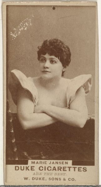 Editor: Here we have a portrait from the "Actors and Actresses" series, specifically N45, Type 4, produced between 1885 and 1891 by Allen & Ginter for Virginia Brights Cigarettes. It's a sepia-toned print of a woman, likely an actress of the time. It’s intriguing how this intimate portrait is being used to sell cigarettes! What can you tell me about the historical context here? Curator: Absolutely. These cards were indeed used as marketing tools, tucked inside cigarette packs. We must consider the gaze here. Who is this portrait intended for, and what's the message? It reflects a time of nascent consumerism where women's images were powerfully associated with products, subtly promoting aspirations of glamour, beauty and social status alongside the purchase of cigarettes. Consider also the power dynamics at play: The commodification of the actress' image, and its potential effect on women in the workforce, not necessarily on stage, whose physical appearance would become more strictly policed. How do you see that working here? Editor: I guess the implication is that if you smoke these cigarettes, you too can associate with this kind of glamour and elegance. Do you see this as a proto-feminist or anti-feminist gesture? Curator: It's complicated. The actress, as a working woman, achieved a certain independence. However, her image is exploited within a patriarchal structure for profit. It becomes both an endorsement of a woman’s visibility but only when that visibility sells something. How does this compare to advertising of today? Editor: That's fascinating – a double-edged sword then. So, on the one hand, there's visibility and possibly a measure of agency, but within limits dictated by consumerism and gendered expectations. Looking at advertising today, it's clear we still grapple with similar issues. Curator: Precisely. Understanding the nuanced historical contexts can shed light on the complexities of representation, power, and gender, and how they continue to inform contemporary media.