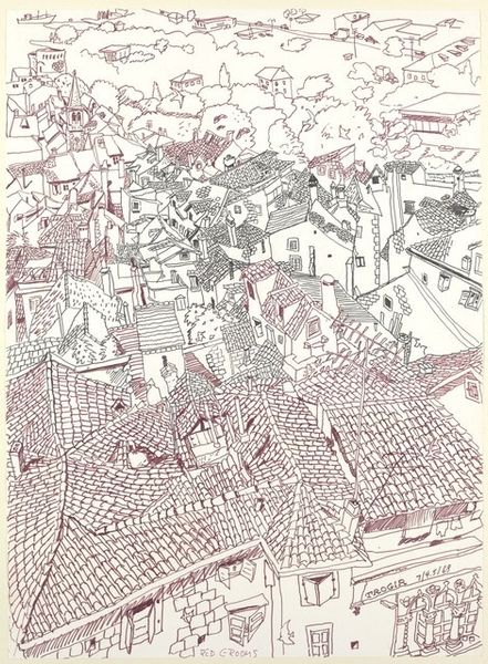 Kuzma Petrov-Vodkin made this drawing of roofs, we're not sure when. The black and white palette is so pared back. Every mark is made to count. It's like he's searching for the essence of seeing. The textures he conjures with simple lines are amazing. Look how the strokes of the pen create depth, making you feel like you could fall into the narrow streets. You can almost feel the rough surfaces of the buildings, the sun beating down on the roofs. And that rooftop scene, with those tiny figures? They’re like actors on a stage, caught in a moment, but they're also just marks on paper, illusions made real. The way he's tilted the perspective reminds me of some of the German Expressionists, like maybe Kirchner, but stripped down, made more direct. It's a reminder that art isn't about perfect representation. It's about finding new ways to see and feel the world.