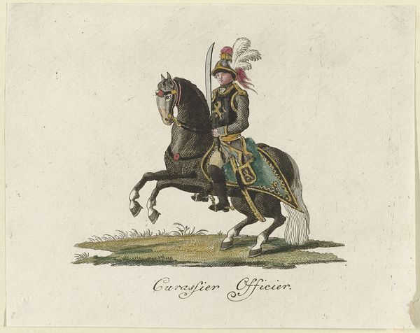 This small, hand-colored etching, titled 'Heraut en Koning van Wapenen,' depicts a herald and a king on horseback, rendered with delicate lines and subtle washes of color. The printmaking process here is key. Etching allowed for the creation of multiple impressions, making imagery more accessible. The act of hand-coloring each print, however, introduces slight variations, reminding us of the individual labor involved. It’s a process caught between mass production and unique creation. Look closely at the figures: the herald, carrying a banner emblazoned with a coat of arms, and the king, perhaps reviewing his troops. Consider the context. Prints like these circulated widely, both commemorating and shaping public perception of power. The relatively modest scale and accessible medium speaks to a desire to disseminate imagery beyond the elite circles of courtly painting. The image then becomes an expression of national identity in the making.