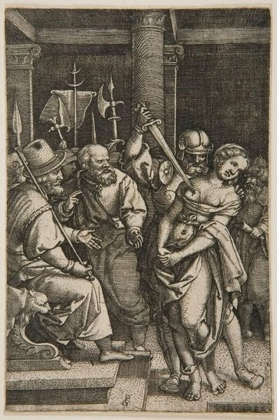 Curator: This is Cornelis Cort’s “Flight into Egypt,” a small but intricate print from the 16th century, now held here at the Harvard Art Museums. Editor: It feels charged with emotion. There is a sense of urgency but also tenderness in the rendering of the figures. Curator: Cort, who lived from 1533 to 1578, excelled at disseminating the designs of other artists through engravings. He aimed to spread artistic ideas. Editor: The angels above offering what look like dates evoke a sense of divine blessing and provisioning during this dangerous journey. Curator: Precisely. The imagery resonates with earlier depictions of the Flight into Egypt but also reflects the visual language of the Counter-Reformation. Editor: This depiction of the Holy Family fleeing Herod’s decree carries a potent symbolic message about refuge and divine protection that still resonates today. Curator: Considering Cort's role in disseminating ideas, it's fascinating to contemplate how this image and others like it influenced popular piety. Editor: Absolutely. This print condenses a wealth of cultural anxieties and spiritual hopes into a single, powerful image.