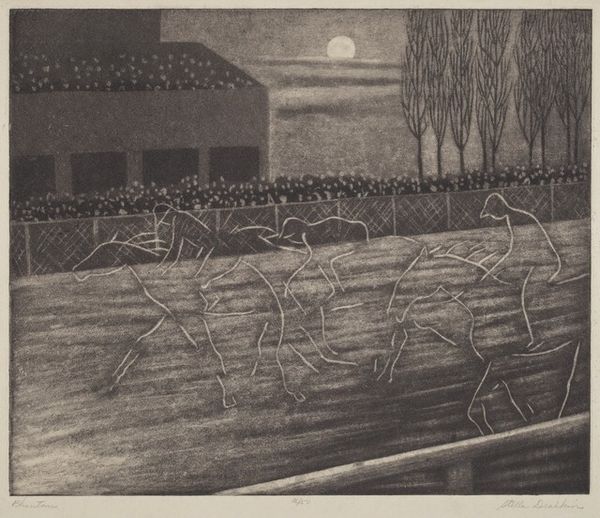 Curator: Looking at "Train Station," a 1913 woodcut print by Werner Gothein, the eye is immediately drawn to the interplay of harsh black and white. Editor: It strikes me as melancholic. The rigid geometry mixed with those figures seems to isolate them, lost amidst a modern urban landscape. The rough texture accentuates this sense of alienation. Curator: Absolutely. The stark contrasts in this Expressionist piece tap into anxieties about modernization, which really dominated social discourse in early 20th-century Germany. Consider the political context: Industrialization altered social and familial structures irrevocably, destabilizing gender roles and labor expectations, particularly after mass conscription for military and industrial labour changed societal and political attitudes toward women and workers in general. Editor: The vertical lines forming the station pillars create this rhythm. It also gives off this somber, almost oppressive visual of columns and pillars from classical architecture or cathedrals of that era, representing permanence and rigid structure, clashing against this dynamic modern force of transport and rapid change. Curator: Yes, that tension is palpable. What seems like an exciting new opportunity for increased mobility became, for some, a heavy visual marker of cultural destabilization and psychological fragmentation of self within the modern city. Those abstracted figures look rather defeated within it, like they're waiting for someone to return who has been taken by industry or war. Editor: Exactly. The limited tonal range makes it intensely graphic, forcing us to see the raw construction, and by extension, question progress at the dawn of technological boom. In an era of heightened symbolic importance of travel by rail, like war-time trains, this is a potent symbol. Curator: That reading layers additional narratives: anxieties about German militarization prior to WWI; and the loss and grief attached to that political upheaval as more young men departed for the fronts. This image presents us with the complexities of change, experienced individually and collectively. Editor: Gothein masterfully captured not just a place, but a cultural mood, an ambivalent relationship with modernization through enduring symbols of society, trauma and collective social progress. Curator: Ultimately, "Train Station" stands as a vital Expressionist work to reflect the unease percolating beneath Germany’s social fabric. Editor: A disquiet that, poignantly, resonates still.