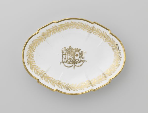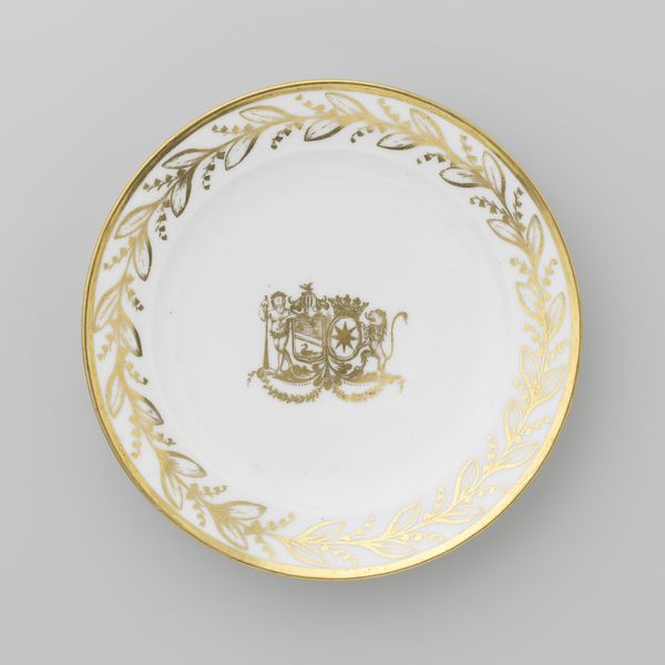 Editor: This is a ceramic dish made around 1790 to 1800, decorated with the coat of arms of Hendrik Peter Godfried Quack and Isabella Gertraud von Carnap. It’s currently held at the Rijksmuseum. I'm immediately drawn to the symmetry of the design and the delicate use of gold. How would you interpret its visual language? Curator: The dish presents a compelling interplay between Rococo elegance and heraldic symbolism. Consider first the framing device: a continuous wreath of gilded foliage. Observe the even distribution, the repetitive motif, how it establishes a sense of order and contained luxury. Then, turn to the central emblem. How do these elements interact visually? Editor: Well, the central crest, also in gold, breaks the uniformity of the wreath. The figures on either side of the shield and the star device add visual complexity. Curator: Precisely. And how does the artist employ color and space? The stark contrast between the white ceramic ground and the gold leaf elevates the design from mere utility to ornamental art. The empty space amplifies the impact of both frame and emblem. Note also the line work, defining not only shape but reflecting light. What inferences do you draw? Editor: I see how the deliberate use of symmetry and contrast creates a balanced and refined aesthetic. It speaks to wealth, but also to a controlled, perhaps even idealized, vision of family identity through heraldry. The choice of Rococo style reinforces that impression. Curator: Indeed. By analysing the form, structure, and the interplay of its visual components, we gain insight into the dish’s function as more than just a practical object, but also a reflection of social status and artistic trends of the period. Editor: Thank you. That really sheds light on how to look at the choices in design and materiality.