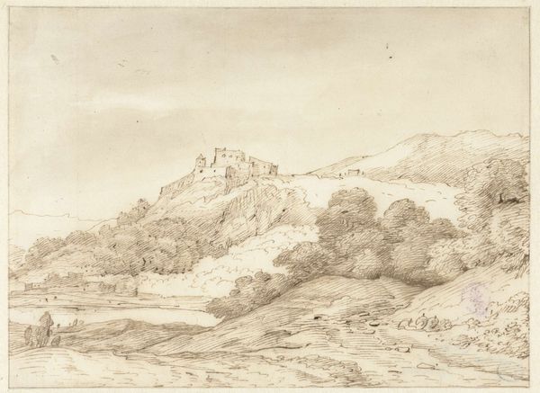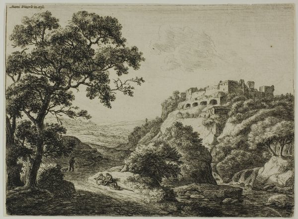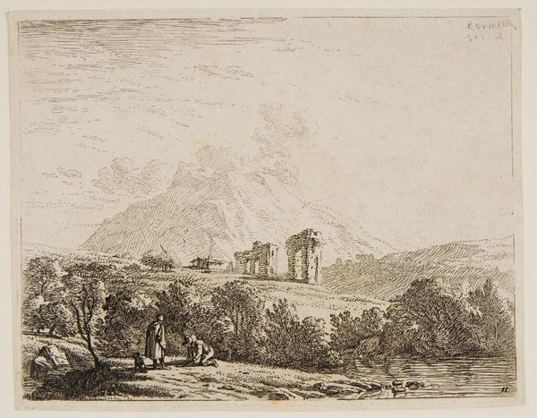 Editor: So, here we have "Two Peddlers by a River," an engraving from somewhere between 1623 and 1705, currently at the Rijksmuseum and created by an anonymous artist. It's fascinating, especially the density of the lines used to create depth. What can you tell me about it? Curator: What I see immediately is an etching emphasizing the relationship between labor and the land. Notice how the fine lines, the product of meticulous work, mimic the strata of the rock face, connecting the human effort of the engraver to the natural world being depicted. Editor: That's interesting! So, the act of *making* the image mirrors the *image* itself. Curator: Precisely! The seemingly simple scene of two peddlers isn’t just a pastoral view. It is an assertion of human interaction with the landscape. Consider the production of engravings; the skilled labor, the printing process, and the circulation of these images to a broader market. This wasn’t merely aesthetic, but deeply tied to burgeoning commercial activity. How does seeing this impact your impression of the landscape itself? Editor: It reframes it! It’s not just a pretty scene. The existence of this image meant it was part of the marketplace; people bought, sold, and traded it. Curator: Indeed. And consider the materials used: the paper, the ink, the metal plate, and the tools. Each material element speaks to the technical and industrial capacities of the time. Where were these things sourced? What was the value and availability of them? Editor: That adds a completely different layer. So, viewing the work, you consider labor, access, production... not just what’s *in* the frame, but everything that went *into* making the frame! Curator: Exactly! Seeing the art this way shifts the focus from aesthetic value to the material and economic networks that underpin its very existence. I hope next time you approach a work of art, you'll ask where it came from.