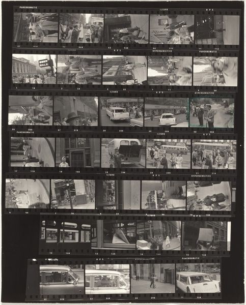 Robert Frank made this photographic work, 'From the Bus 81,' using black and white film, a material that inherently captures light and shadow, transforming everyday scenes into stark, contrasting images. The images are in strips. The film material itself tells a story, documenting moments of everyday life, from street scenes to intimate encounters on public transportation. Frank’s method involved keenly observing and capturing fleeting instances, highlighting the grit and authenticity of American life, in the 20th century. The raw, grainy texture of the film enhances the sense of immediacy. The work offers a glimpse into the social and cultural fabric of the time, reflecting themes of class and labor. It immortalizes these candid moments. Frank challenges traditional notions of fine art photography, elevating the mundane to the artistic, and reminding us of the importance of material, process, and social context in understanding art's deeper meanings.