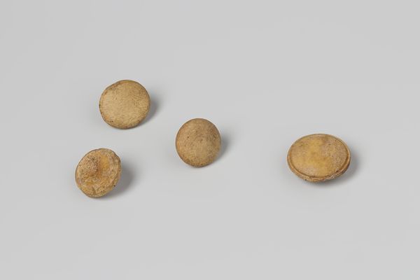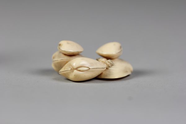 Curator: The work before us, dating from the 19th century, is titled "Pile of Eight Ginkgo Nuts," attributed to Kiyokatsu. It’s part of our collection of Asian art and made of ivory. What do you make of it at first glance? Editor: Well, my immediate impression is one of subdued opulence. The color, while restrained, hints at a quiet luxury. The repetition of forms creates a simple yet satisfying pattern. It looks edible. Curator: Precisely. The simple arrangement directs the eye around the slight variations within this cluster of near-identical forms, which establishes internal echoes across their smooth surfaces. It highlights their shared spherical geometry but also sets into relief subtle asymmetries that suggest organic development and artistic handcrafting. Editor: Absolutely. Thinking about ivory and its use during this period, particularly in Japan, shifts my reading. Ivory objects, or netsuke such as this, often served as luxury items, reflections of wealth, status, and the intricate craftsmanship prized by the upper classes. Did the depiction of ginkgo nuts hold a particular significance? Curator: Yes, indeed. Ginkgo nuts are themselves appreciated within Japanese culture. Ginkgo trees, known for their resilience, represent longevity, hope, and a link to the past, since they are something of a "living fossil". Each individual nut then represents a wish or prayer. Consider what a dense convergence of symbol and craft. Editor: That contextual overlay deeply enriches how one perceives the materiality of the piece too. The smooth ivory emulating the natural form now points towards specific values – prosperity and generational stability for instance. So what initially appeared understated begins to vibrate with intent. I almost wonder what handling one of these forms must have felt like for the person who owned it, given how imbued it was with meaning and hope. Curator: I agree completely. Its compact size draws one in to see its details closely. Each ginkgo carved so seamlessly contributes to a composition in aggregate far grander than its individual pieces might suggest. What began as botanical study grows into social commentary by virtue of its material execution. Editor: So ultimately the sculpture encapsulates an entire micro-society, or rather, a desired outcome for that society within a cluster of replicated hopes. Looking again, what initially seemed passively beautiful turns quite assertive! Curator: Precisely. And it’s in considering these interwoven formal qualities alongside the socio-cultural context that one begins truly to appreciate Kiyokatsu's mastery.