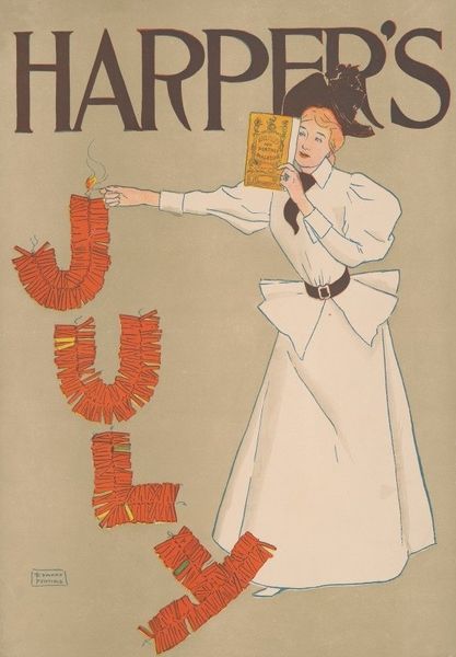 Edward Penfield created this poster "Harper's for June" using lithography. The composition immediately draws the eye to the striking contrast between the warm, bold red of 'June' and the cooler, refined purples and blues of the lettering and the woman's dress, evoking a sense of vibrancy tempered with elegance. Penfield masterfully uses color and form to lead the viewer's gaze. The sinuous lines of the vines guide us from the word 'June' to the central figure of the woman offering a rose, who embodies the grace and sophistication associated with the magazine itself. The roses she carries and offers create a visual harmony, connecting her to the themes of nature and beauty celebrated within the magazine. The poster isn't just an advertisement; it's a cultural artifact that reflects the aesthetic values of its time, and embodies the promise of refinement and intellectual stimulation found within the pages of 'Harper's'. Note how Penfield uses structural techniques to create an atmosphere of both classical beauty and modern sensibility.